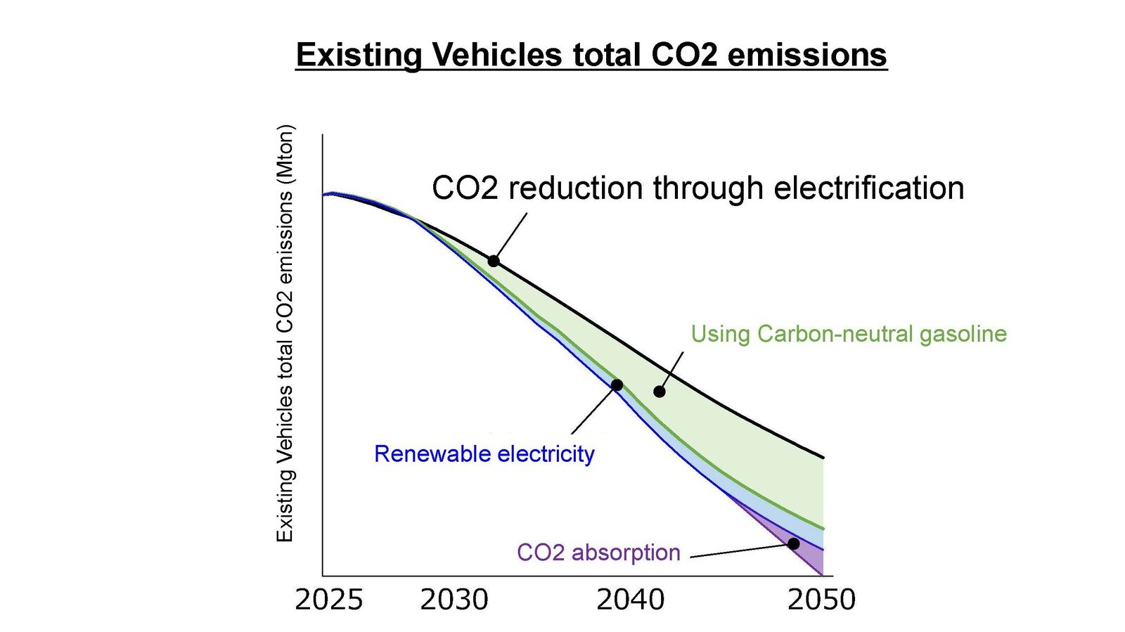 Although electrification will cause CO2 emissions to steadily decline, when you factor in existing vehicles, we recognize that carbon-neutral fuels will be necessary to account for non-electric cars, the area shaded in green.