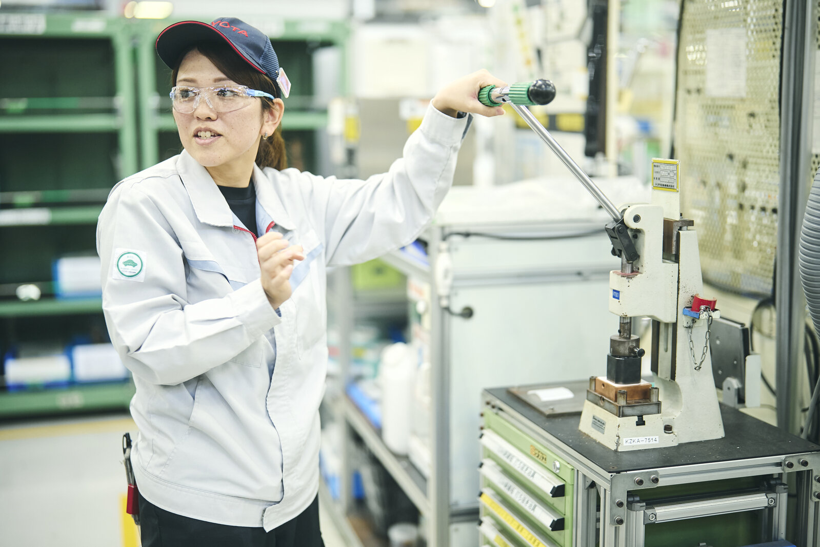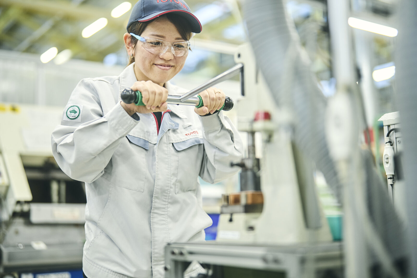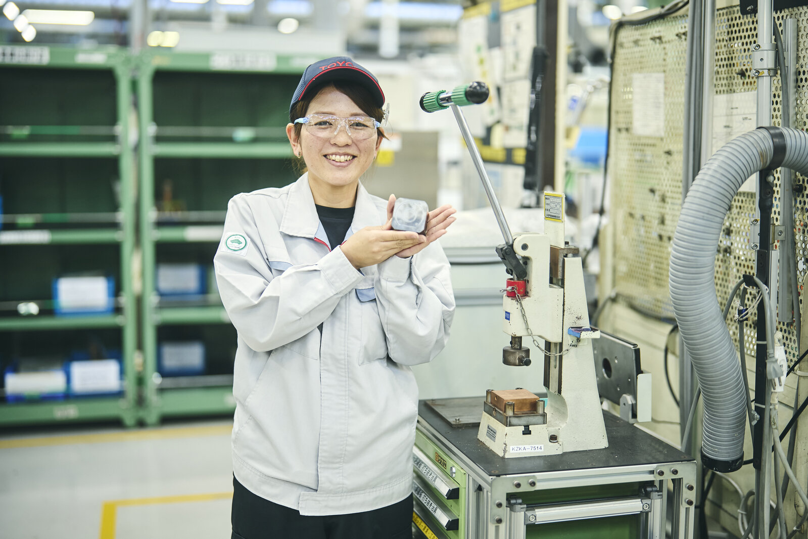 The team that Toyomaki belongs to is tasked with refurbishing and maintaining equipment in production facilities, and her role involves looking after the induction hardening coils.