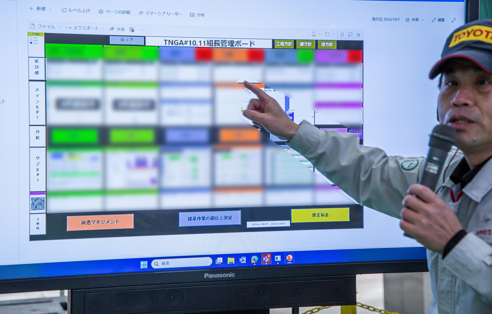 The management boards are used to track each group’s progress in turning plant policies into genba objectives. In the past, group leaders would write out the daily figures and other information on paper. Not only was this task labor-intensive and time-consuming, but it also required storage space for the paperwork. “It was always exhausting,” says Miyanari.