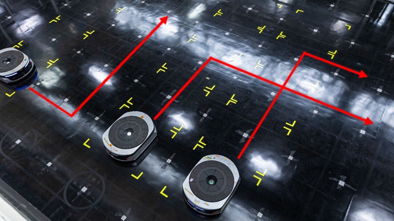 AMRs can move forward, backward, left, or right, and make their way around by reading 2D codes affixed to the floor.