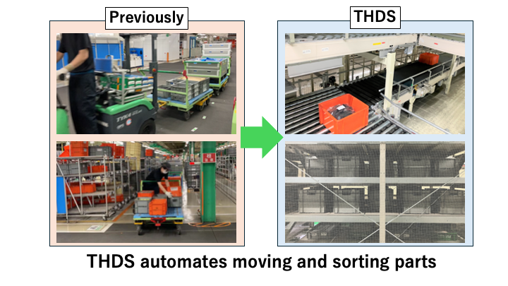 A single car is said to contain some 30,000 parts. As the name suggests, THDS is a system that deals with all the parts delivered by logistics contractors, automatically sorting them according to type and the production stage in which they are required.