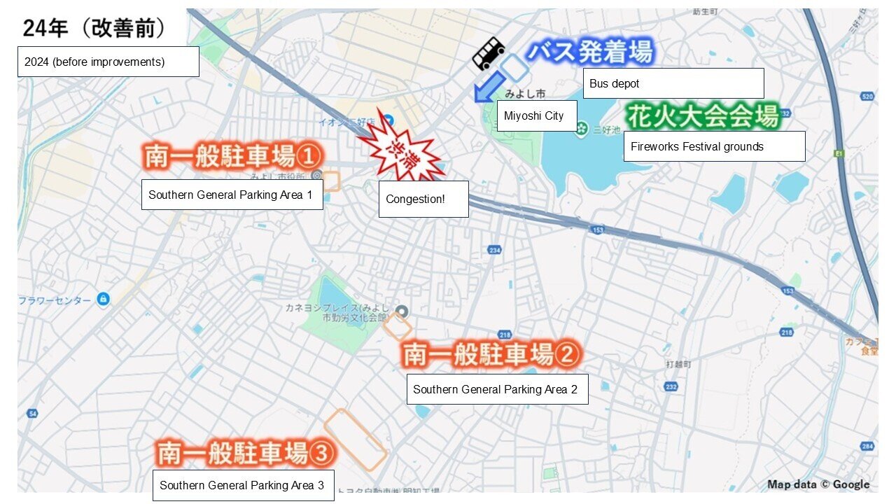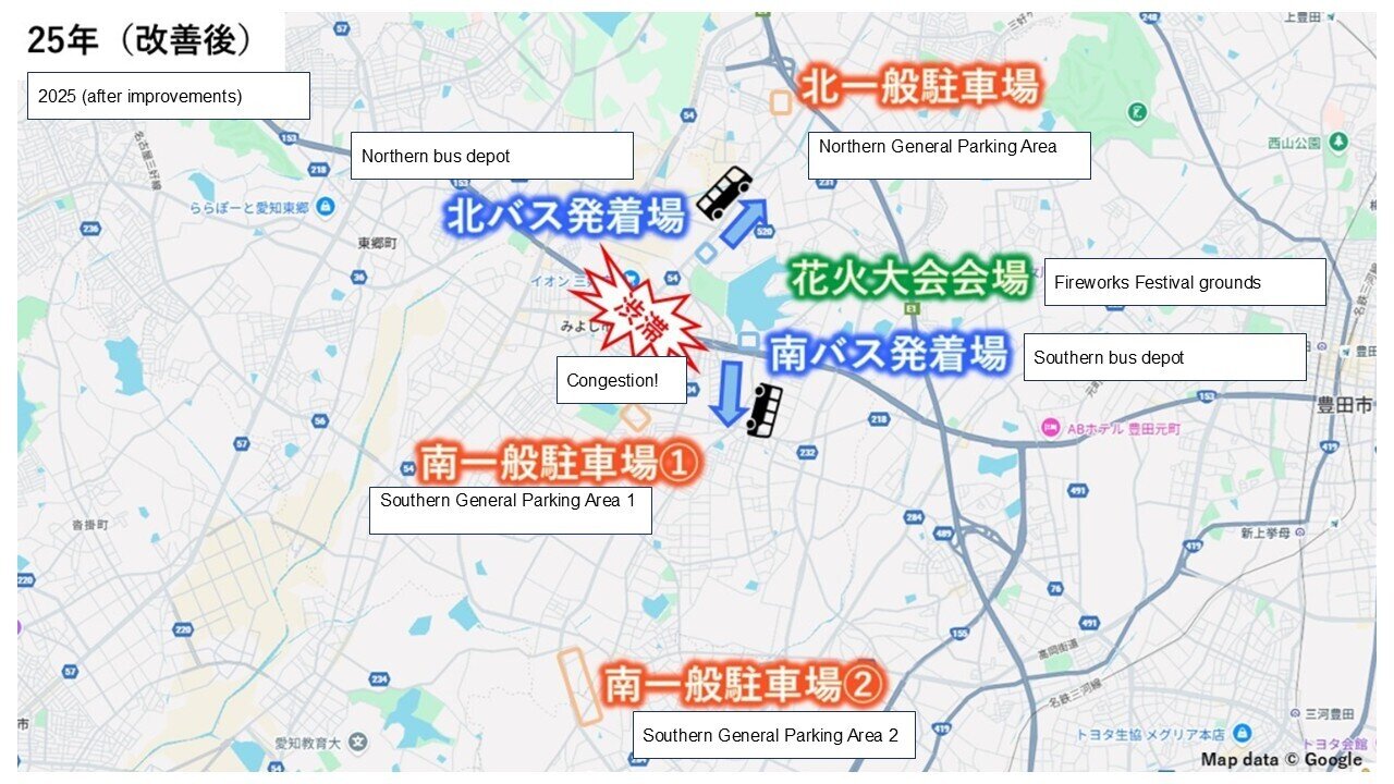 The solution focused on the layout of the shuttle buses and the various parking lots, as well as the operating routes. Until 2024, all general parking had been located to the south of Miyoshi Pond, opposite the shuttle bus terminal (see “South General Parking Areas 1–3” in the figure below).