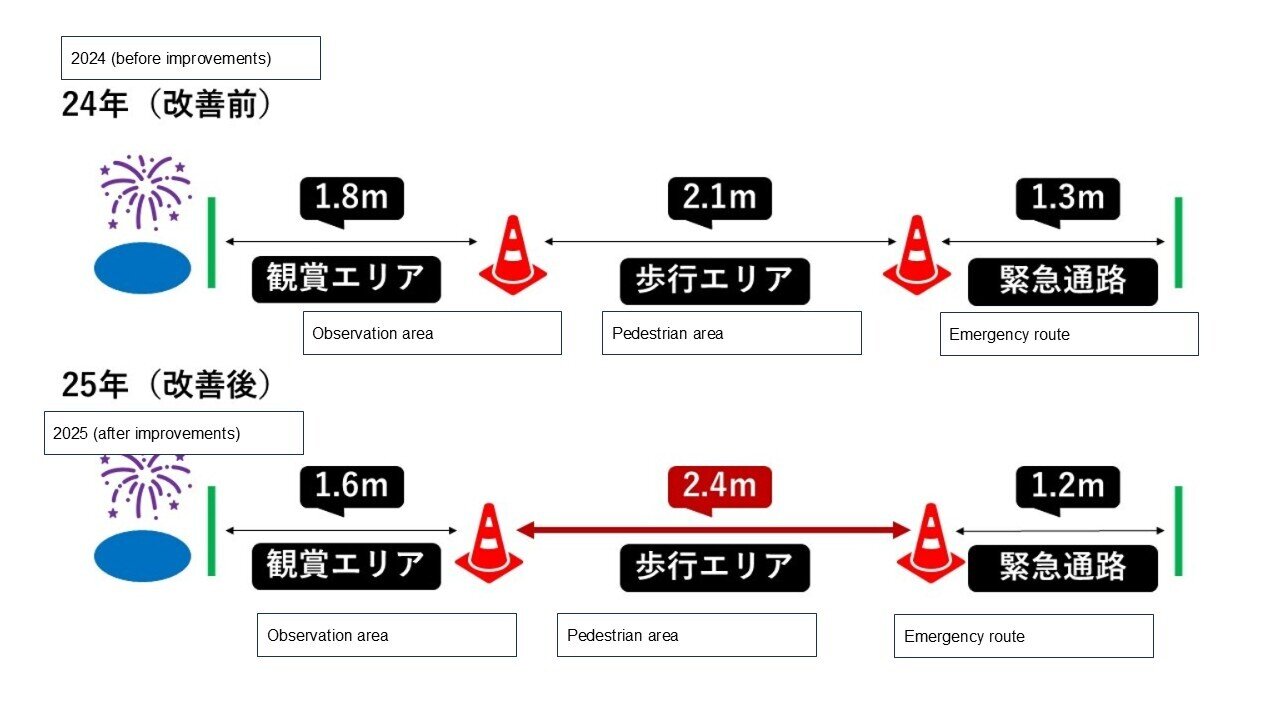 Work was also done to address pedestrian congestion near the Miyoshi Pond embankment by allocating a wider pedestrian area relative to the viewing area and the emergency access route.