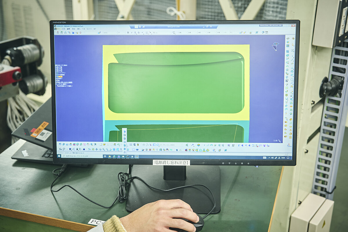 In essence, our job is to ensure the mold faithfully replicates the shape envisioned by the designer. First, I analyze the mold’s 3D data in detail so that I can visualize the form in my mind. Next, I use my fingertips to feel for slight unevenness in the mold’s surface, and precisely even out the areas needing it with a polishing stone.