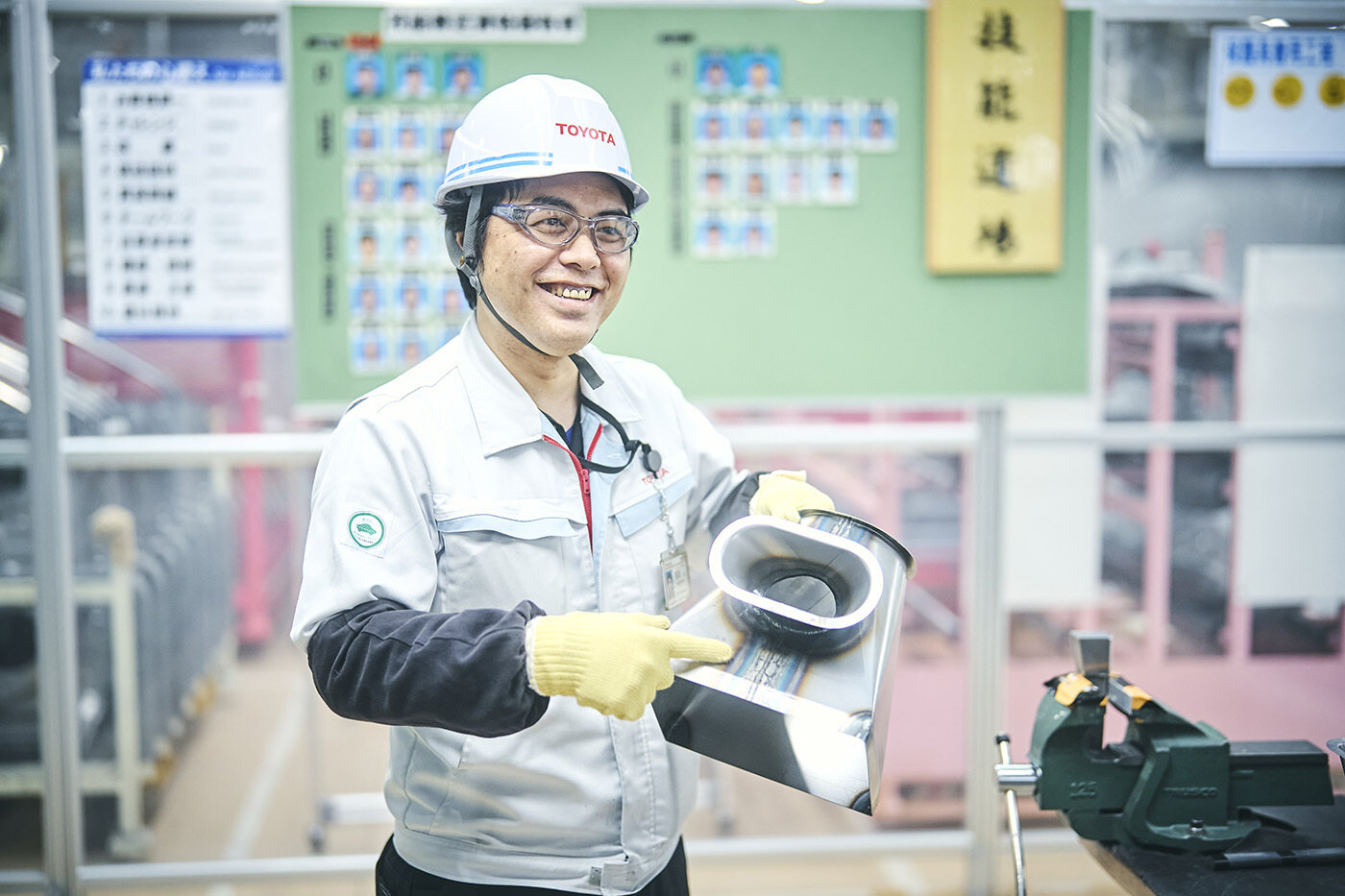 Upon graduating from high school, Maeda joined Toyota Motor Corporation in 1999. The new employee training provided a significant turning point in his life as a craftsperson. As an introduction to sheet metal skills, the recruits tried their hands at hammering an L-shaped steel plate into a cylinder.