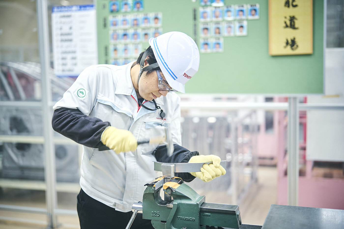 At one of Toyota’s manufacturing skills hubs, located within the Motomachi Plant (Toyota City, Aichi), Takahiro Maeda is working, hammer in hand, to improve the precision of vehicle body parts.