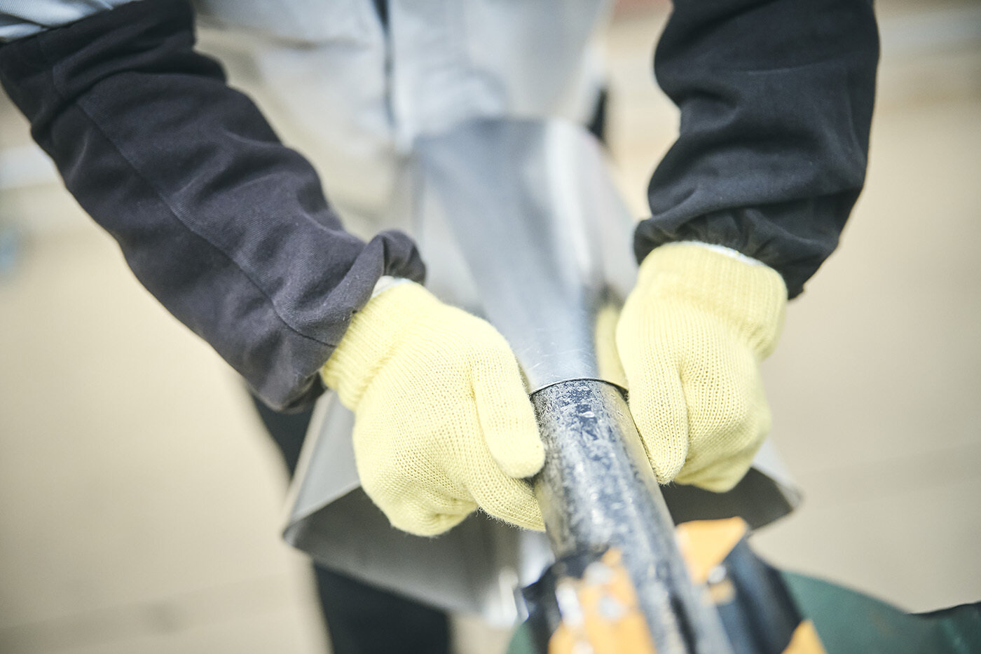 Maeda’s skills have been cultivated over 26 years of on-the-job experience and specialized training for the WorldSkills competition. The level of his expertise is clear to see, even in basic operations. When we visited, Maeda and his pupils demonstrated the task he had performed back in his initial training: hammering an L-shaped steel sheet into a cylindrical form.