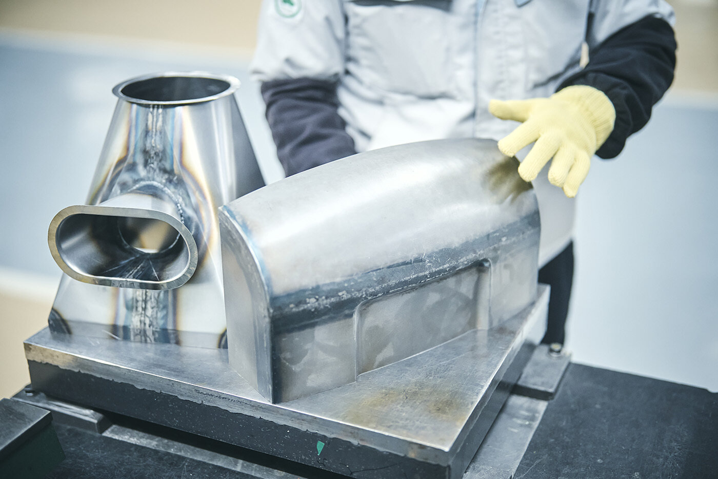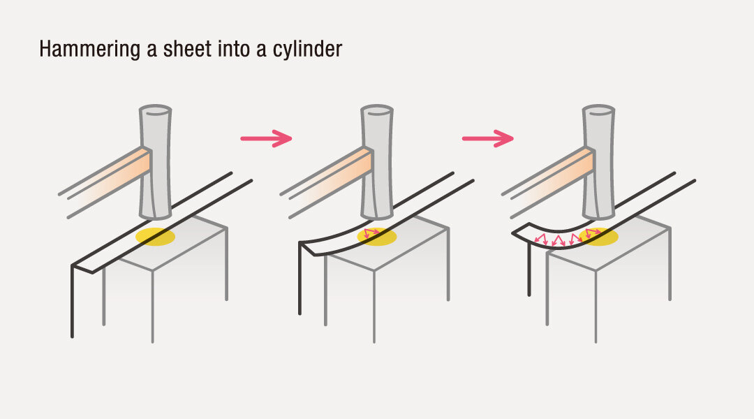 The sheet metal skills that Maeda sought to master can be divided into two broad categories. One is bending, which entails shaping a sheet by hand over a pipe or other object to create curved surfaces. The other is hammering—striking the metal with a hammer to create the desired three-dimensional forms.