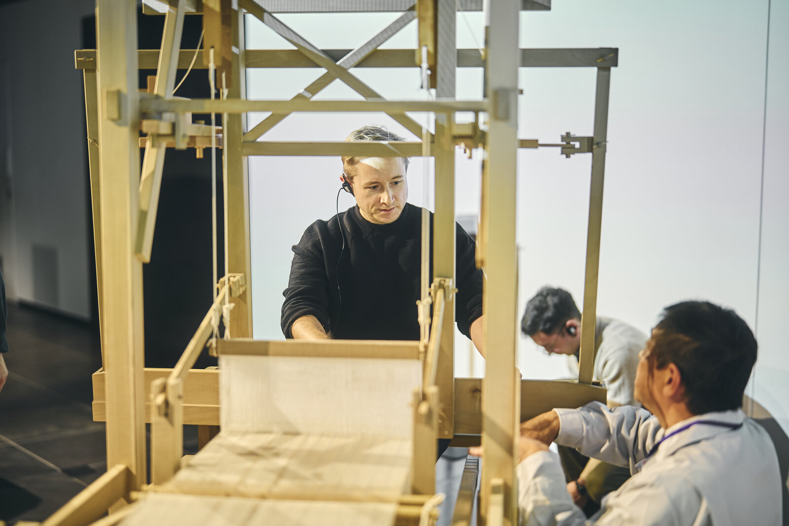 The sessions then move to the loom, where participants try their hands at weaving fabric, sharing in the insights and lessons that Kenmochi gained through the process of rebuilding the instrument.