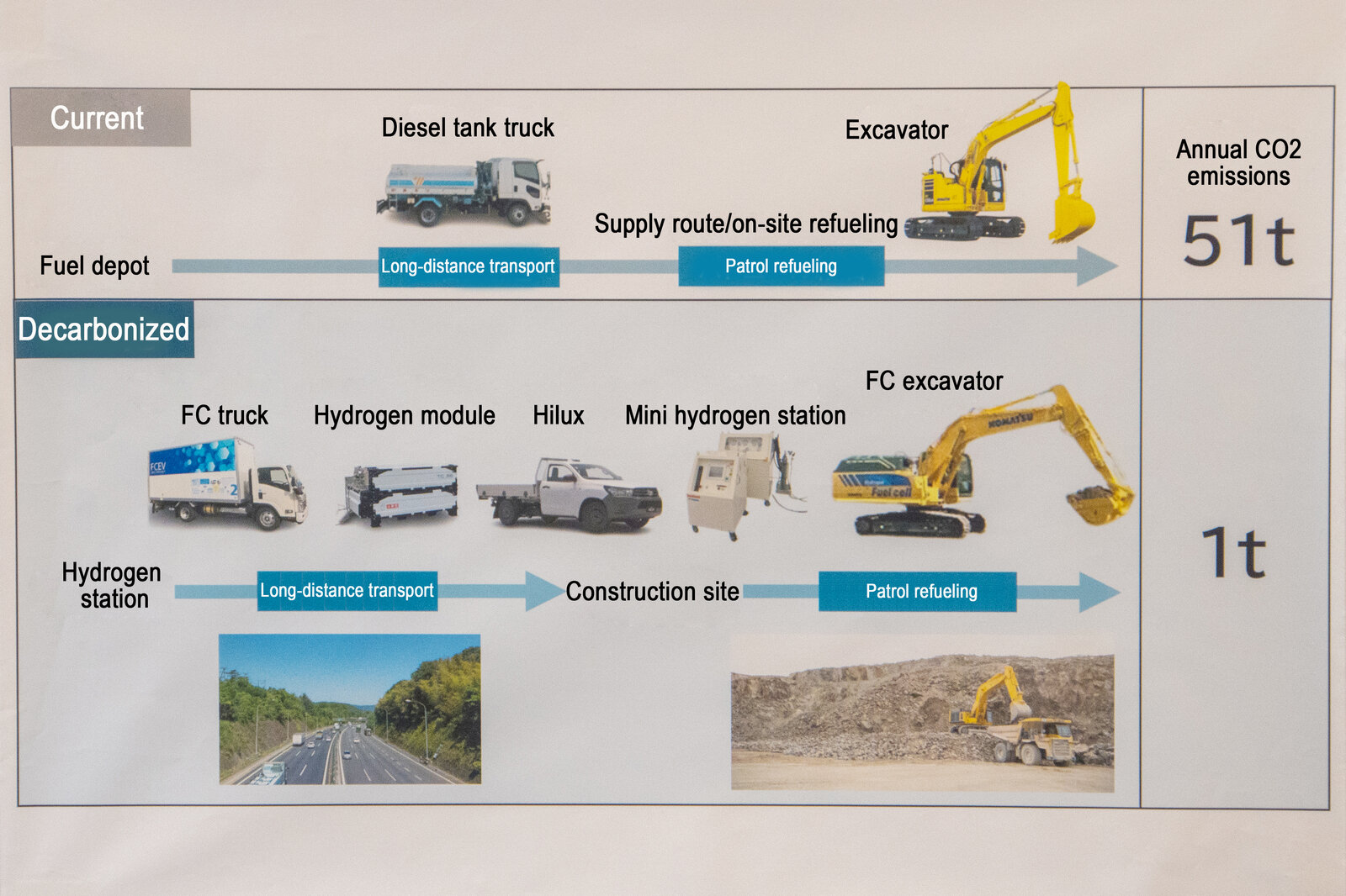 In this scenario, by using an FCEV truck, FC excavator, and diesel Hilux to handle rough terrains—we are trialing an FCEV Hilux, but unfortunately this is not yet available as a product—CO2 emissions would total just one tonne.