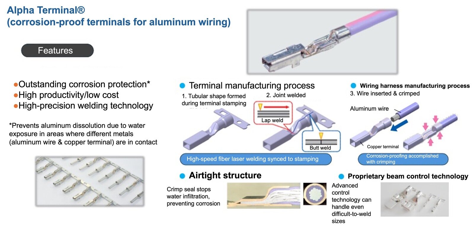 To solve this problem for the new aluminum wiring, Toyota employed Alpha Terminal®, connectors developed by Furukawa Electric using fiber laser welding to create an airtight structure.
