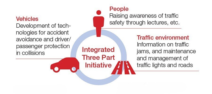 The ultimate dream for a mobility society is zero traffic accidents. To achieve this goal, Toyota has long advocated for a three-pronged approach that involves not only safer vehicles, but also people—from drivers to pedestrians—and the transport environment, such as signals, roads, and other infrastructure.
