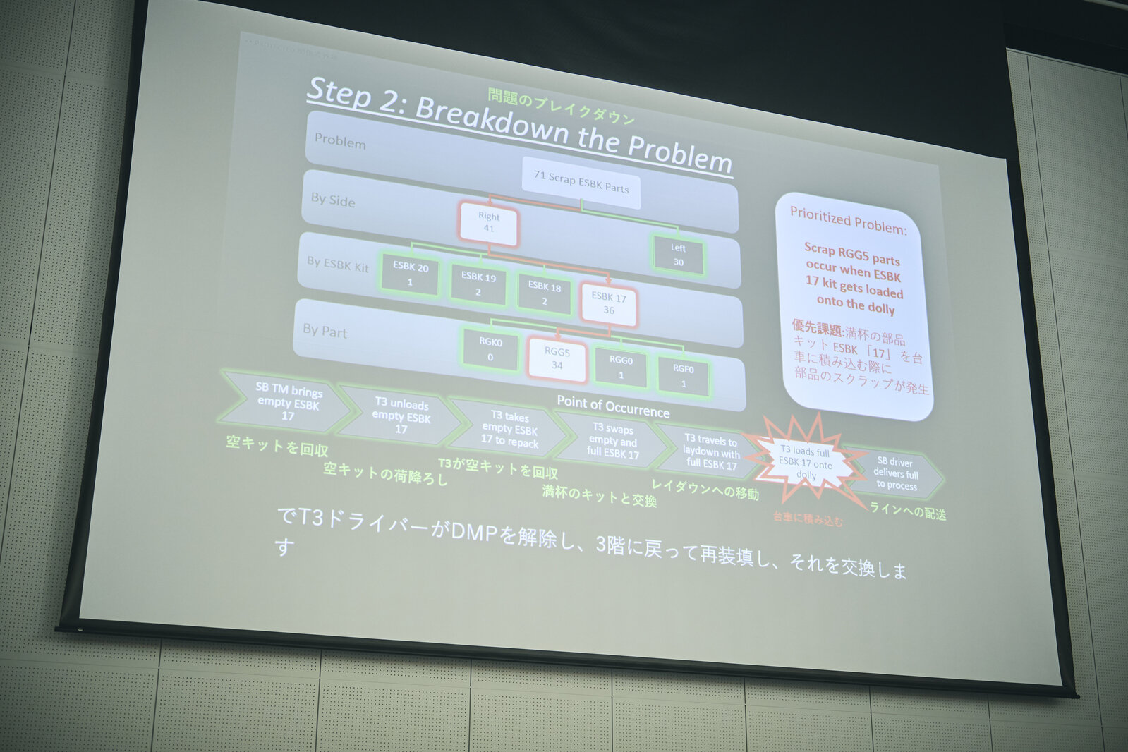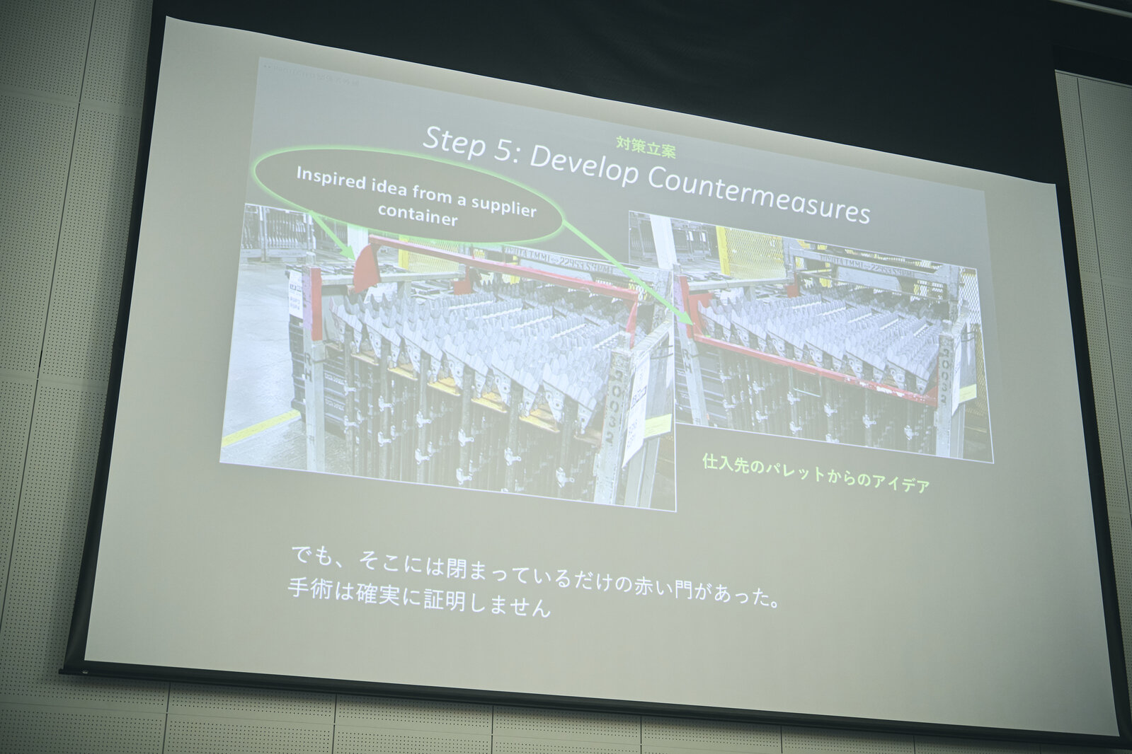 To prevent parts from falling, gates needed to be 16 inches (approx. 41 centimeters) larger. The team shared how they corrected the dimensions, along with plans for standardization and adoption by other departments (referred to as yokoten, from the Japanese).