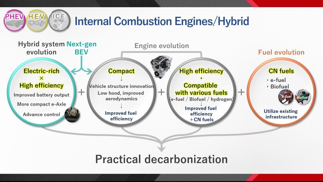 For internal combustion engine vehicles, we are continuing to refine our elemental technologies and strive to achieve the evolution of engines, hybrid systems, and fuels.