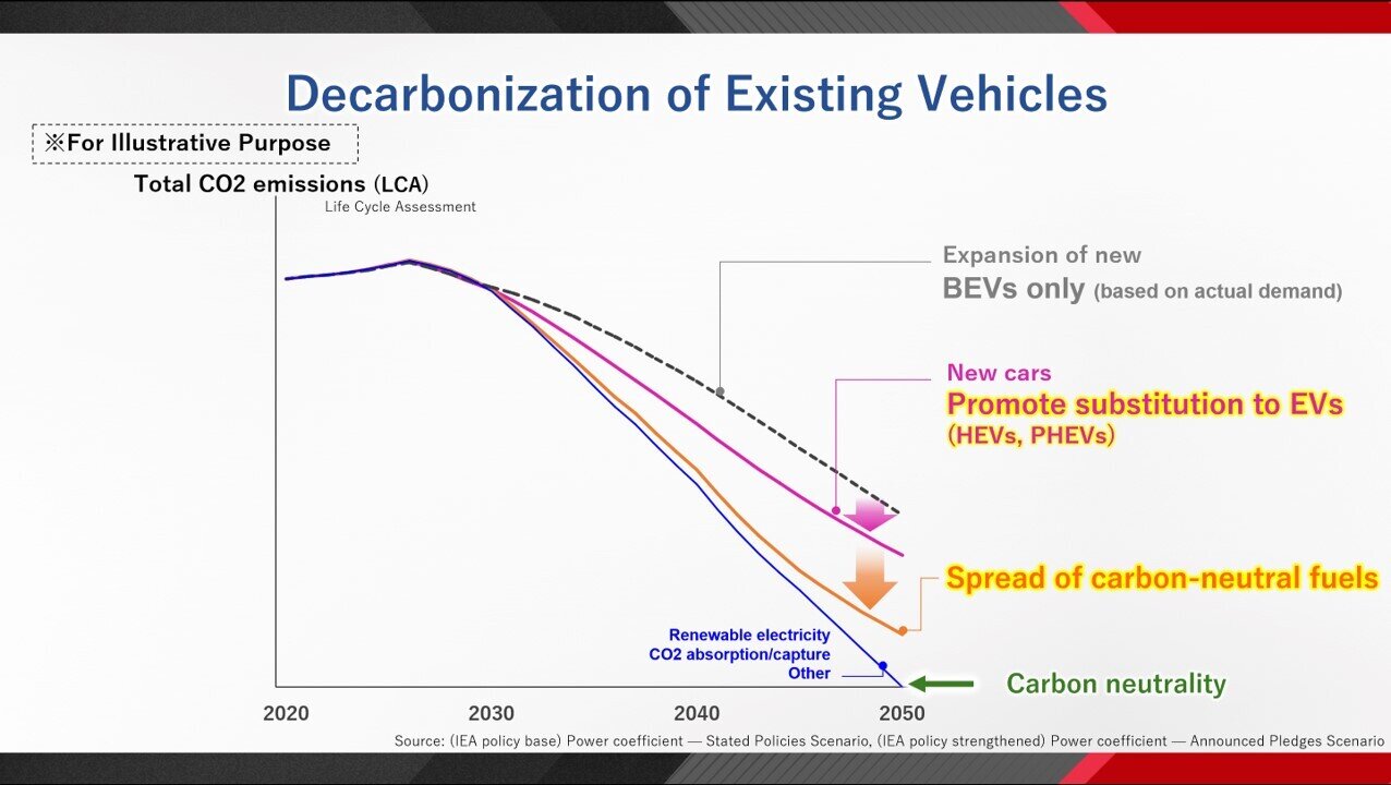 In terms of achieving carbon neutrality when considering the current units of vehicles in operation, it is important to promote the shift to more environmentally friendly mobility, centered on hybrid vehicles, which can immediately reduce CO2 emissions, and to accelerate the spread of carbon-neutral fuels.