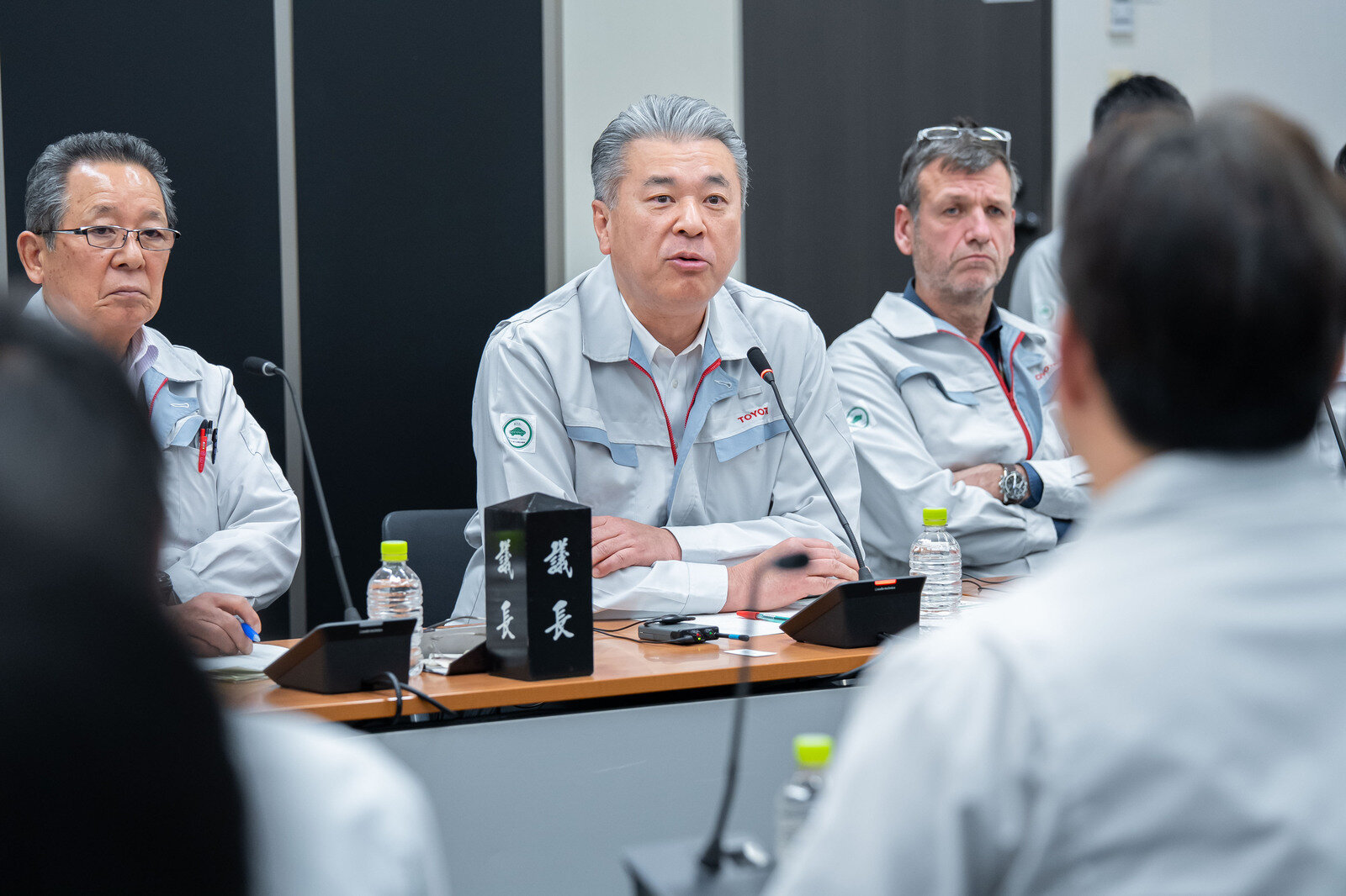 General Administration & Human Resources Group Chief Officer Takanori Azuma presented the results of surveys on job satisfaction at Toyota, along with the issue of low ambition among mid-career hires.