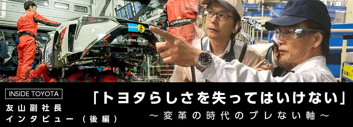 1991年に私は生産技術部から生産調査部に異動した。その部署は大野耐一(元副社長)が設立したTPSの総本山的な組織であったが、その時の直属の上司が豊田係長(現社長)だった。私は豊田の部下として、製造現場の改善から販売店の物流改善まで色々なことをやった。上司の豊田は、その当時から、「トヨタからTPSを取ったら普通の会社になる、その先にトヨタの未来は無い」とずっと危機感を持っていたように思う。 2009年に豊田が社長に就任して、最初の5年間はリーマンショック、品質問題、震災もあった。そうしたことを乗り越えるための5年間だったと思う。次の5年間は、次世代のトヨタに向かって走り出すための言わば準備期間だったと思うが、遂に、2018年1月、TPSを経営の前面に大きく打ち出した。(生産、販売部門まで含むTPS本部が組織化され、友山は本部長に就任)。 100年に一度という激動の時代を生き残るためには、TPSを生産分野はもちろん、事技系や販売流通分野にも徹底し、開発から、生産、販売、アフターサービスに至るまで一貫してビジネスの戦闘能力を上げていかなければならないからだ。
