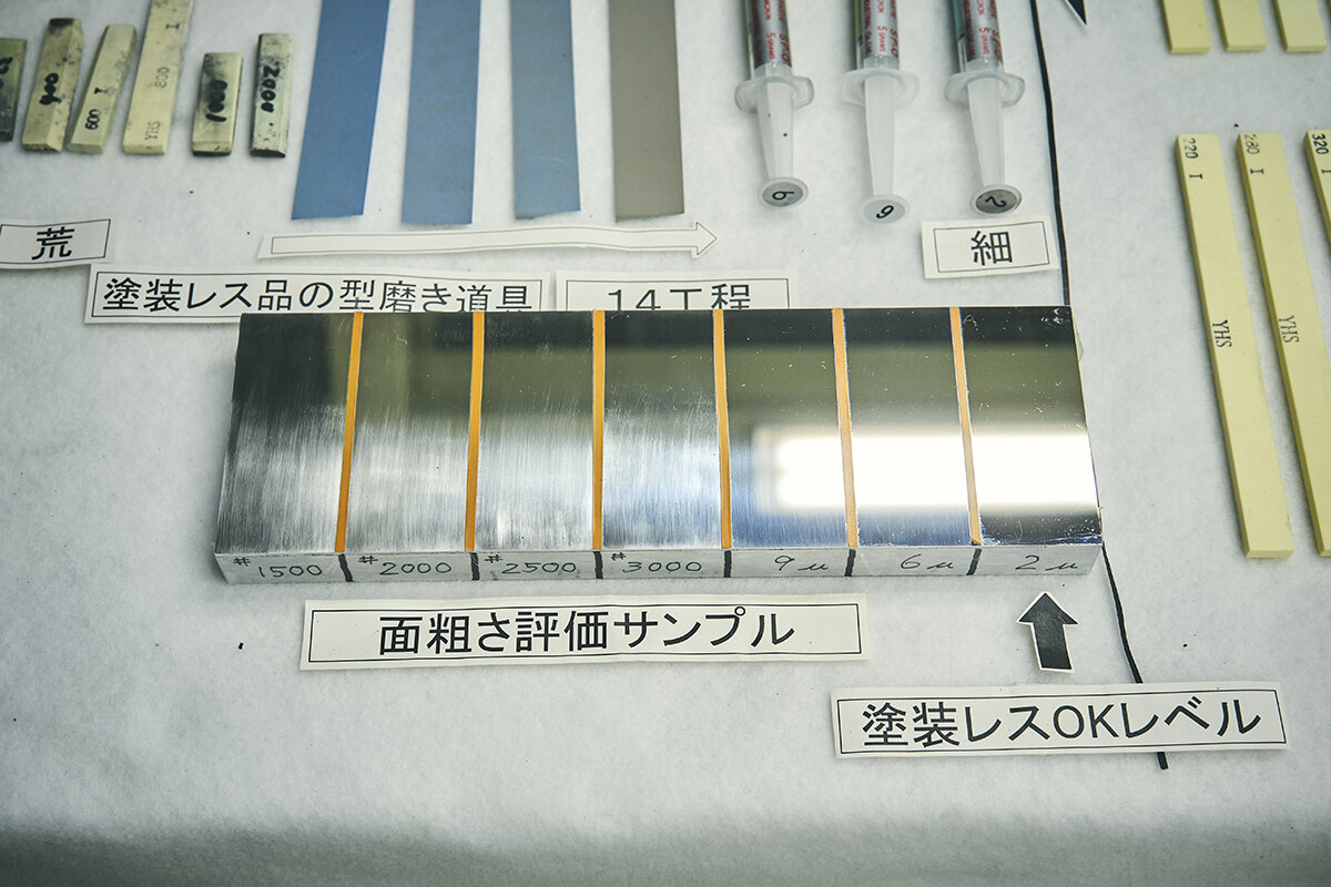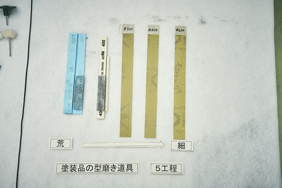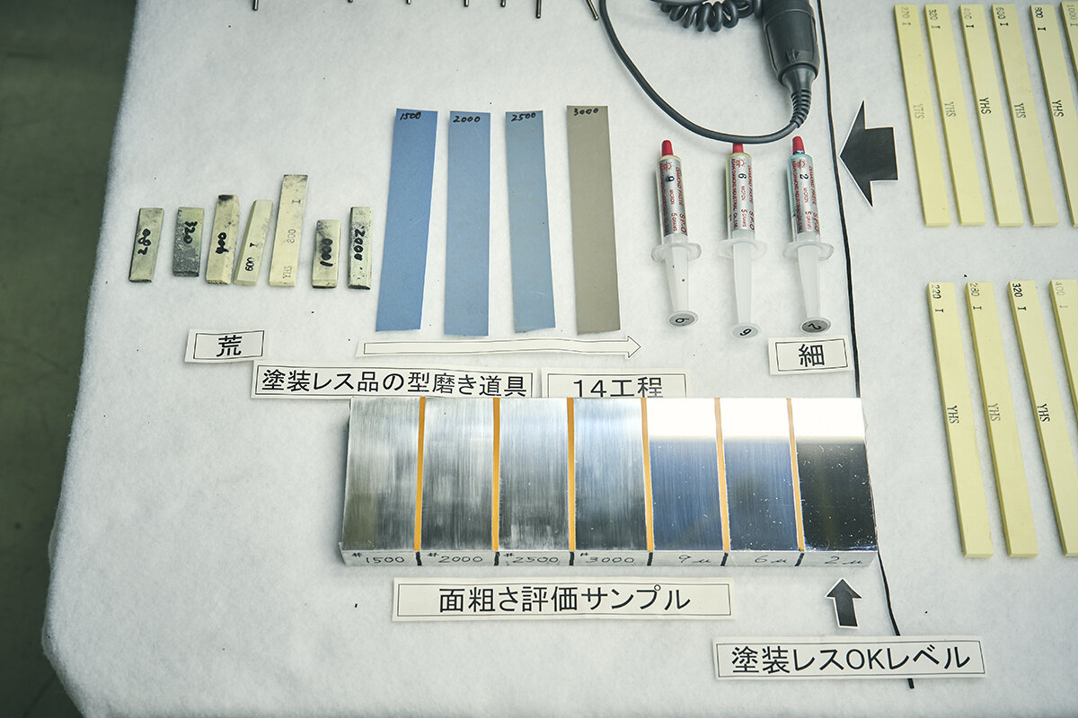 通常の塗装品用の金型は、砥石とサンドペーパー計5種類で5工程の磨きで完成する。しかし、塗装レス用金型の鏡面仕上げには、最終的に砥石7種類、サンドペーパー4種類、研磨用のダイヤモンドペースト3種類を使った14工程が必要だと分かった。