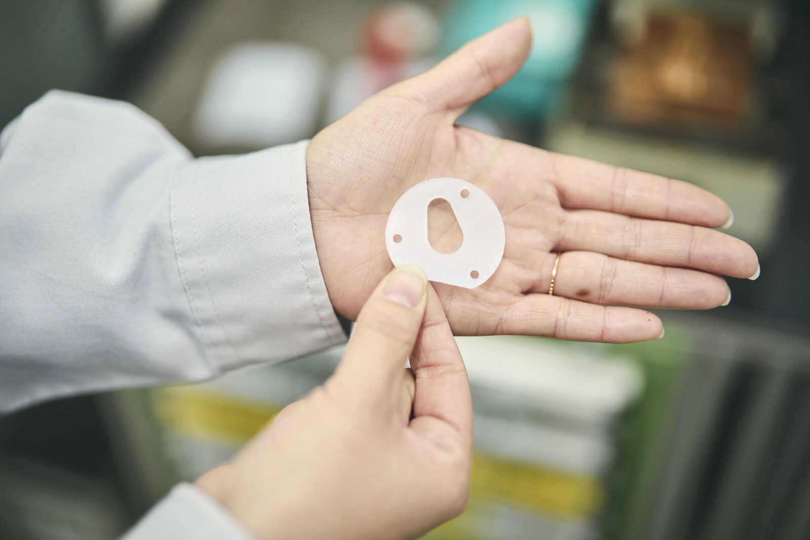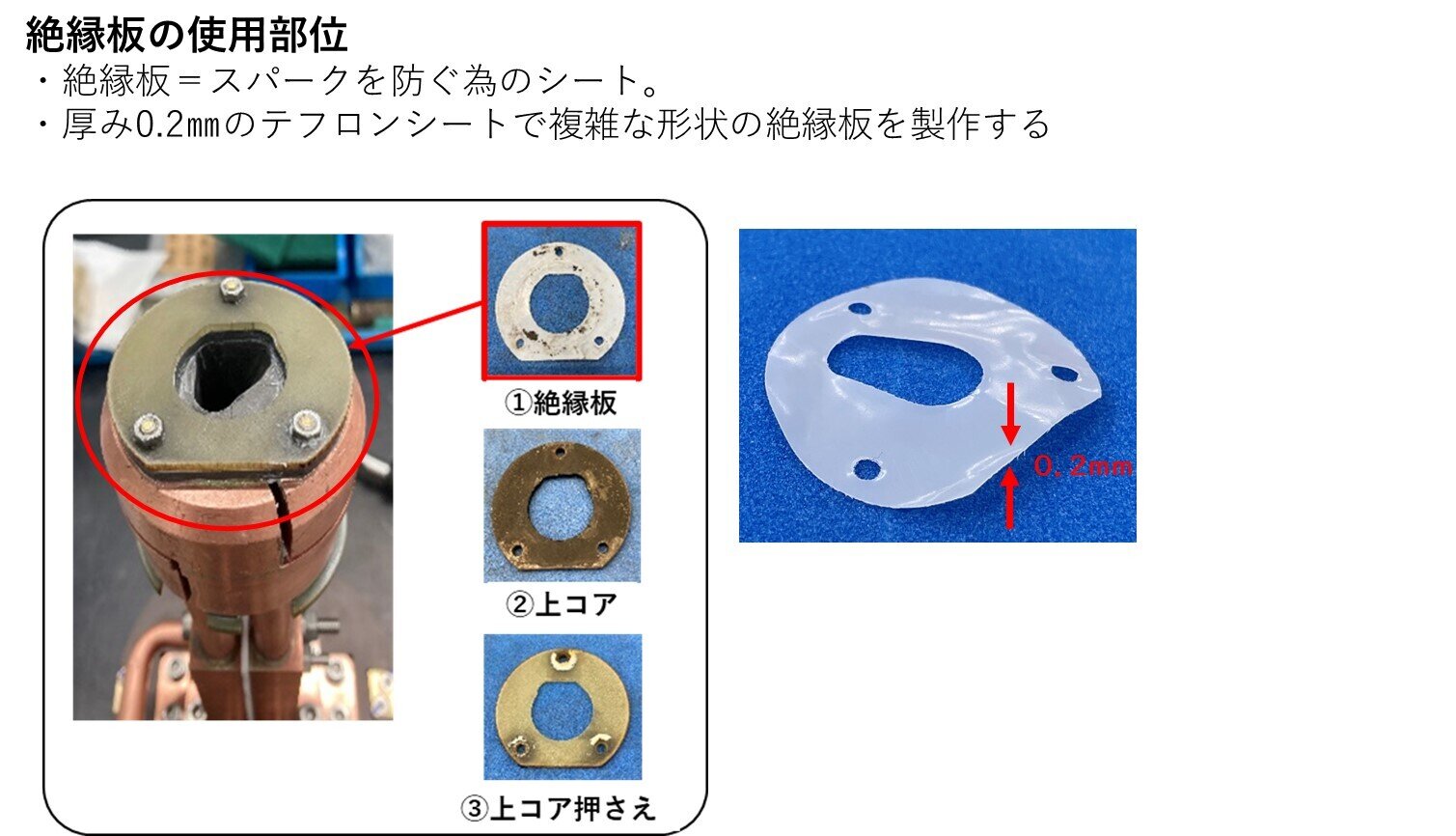 この焼き入れコイルのパーツに「絶縁板」がある。焼き入れコイルの種類ごとに、さまざまな形状の絶縁板を用意する必要があり、再生整備のたびに製作していく。さまざまな大きさや厚みがあるが、なかには0.2mmのテフロンシートでできた絶縁板もある。