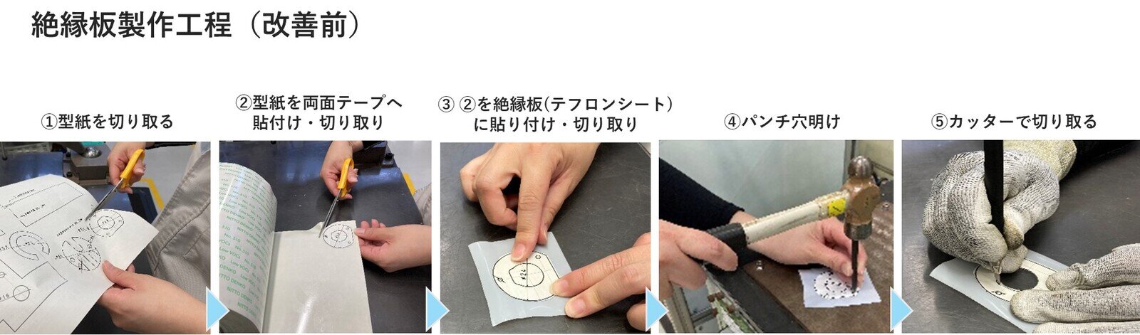 以前は手作業で下図のような工程があり、絶縁板がテフロンシートで薄いうえに、切り抜くサイズが小さく、複雑な形が多いため難しかったという。