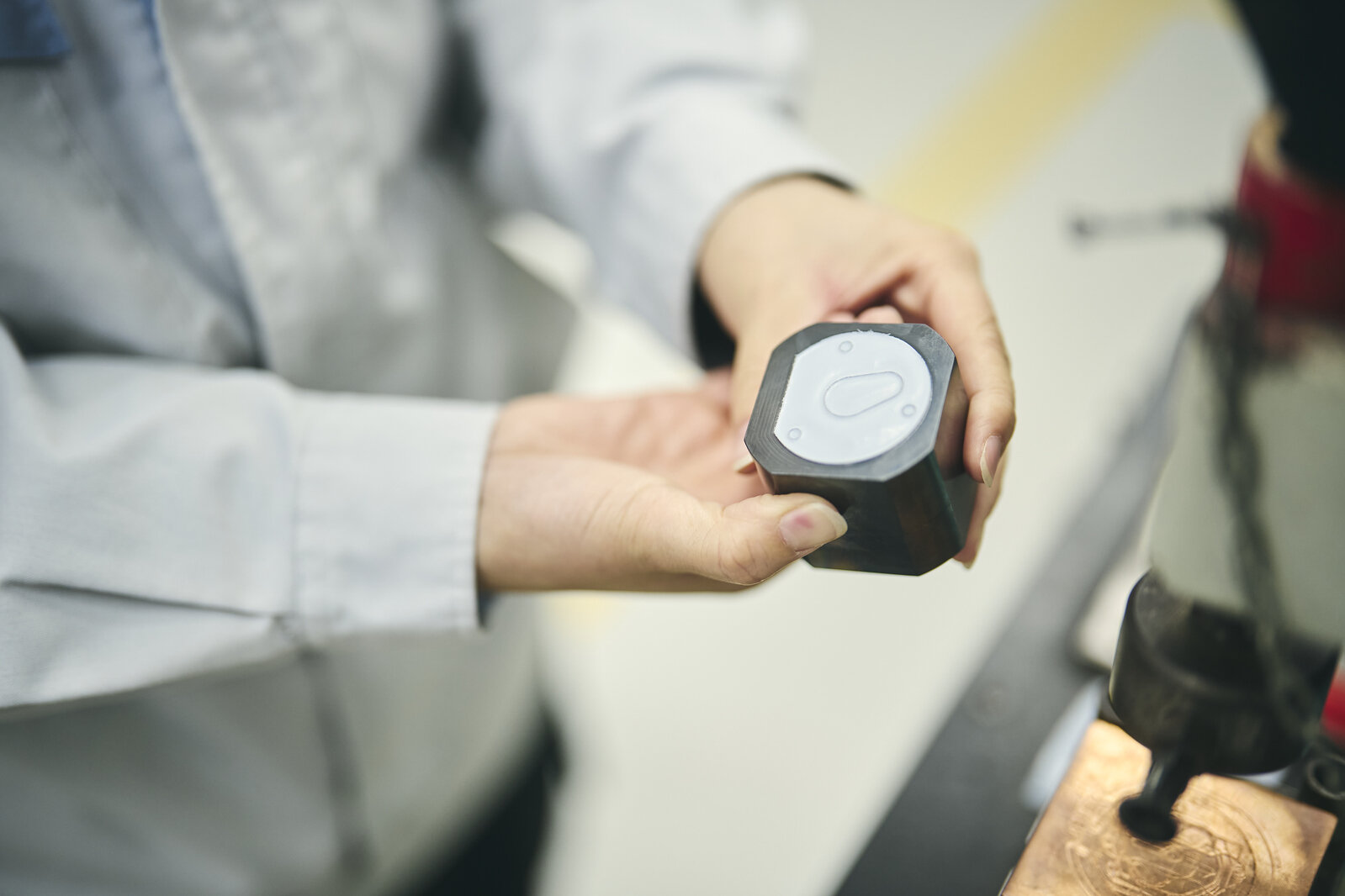 チームリーダーは「ハンドプレス機を使えば、一発で打ち抜ける!」という確信のもと、すぐに図面を作成。工場内の機械加工技術者に声をかけ、金型製作まで驚くべき早さで進行していった。