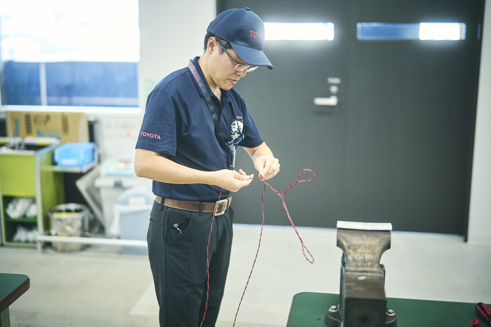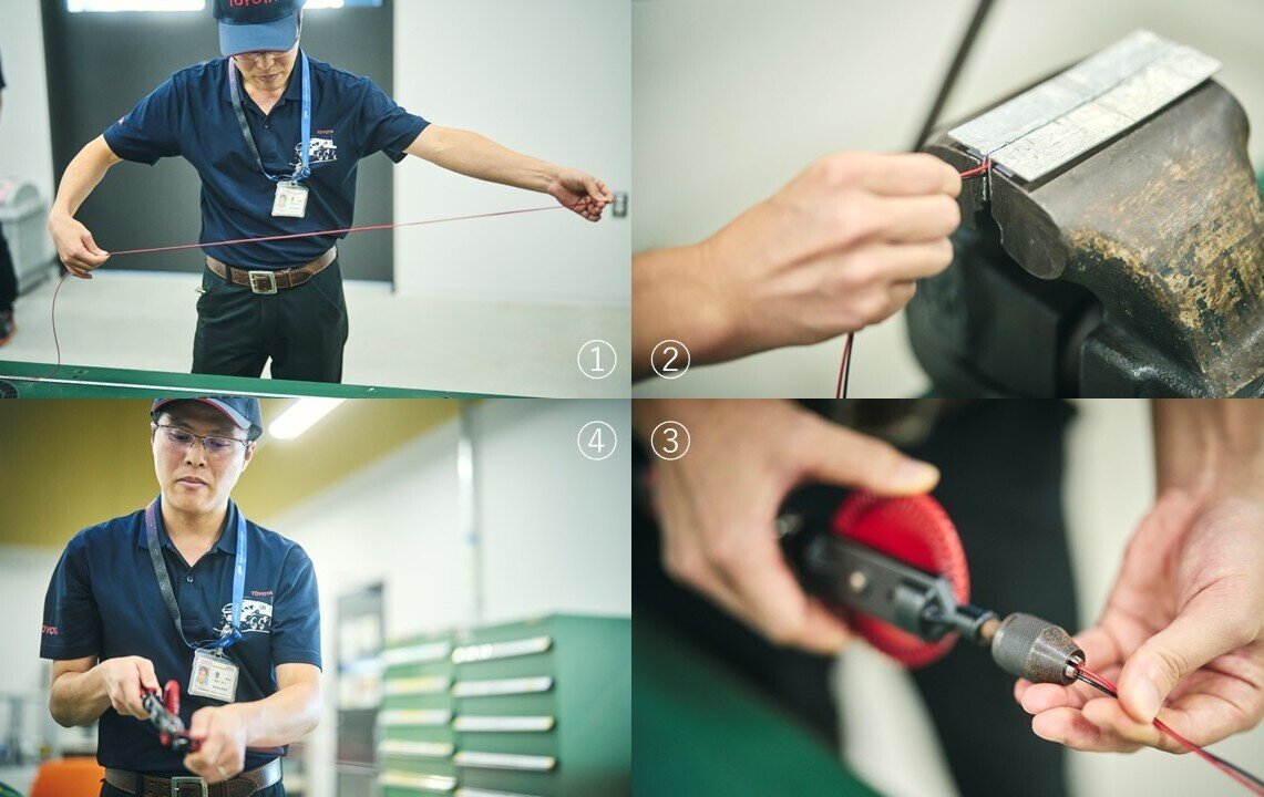 私は2012年入社ですが、昔からつくり方は変わっていませんでした。①必要な長さに2本のケーブルを切り出し、②片側を万力で固定し、③もう片側をハンドドリルに差し込み、④回していきます。