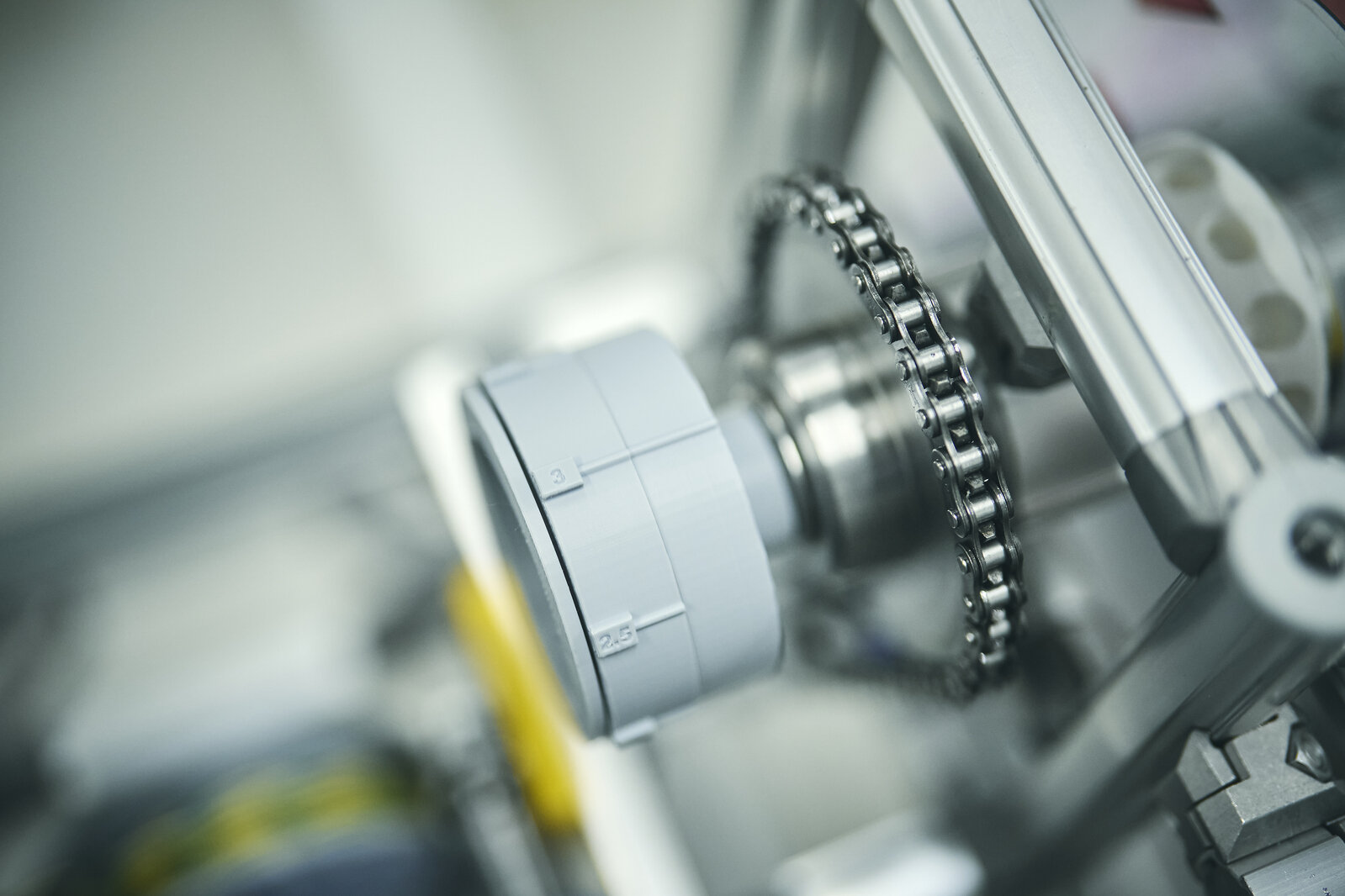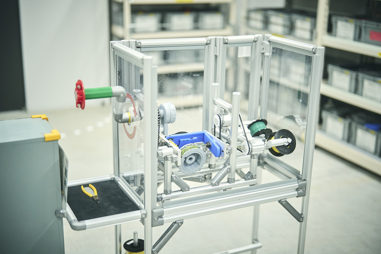 ベースの筐体にはアルミを再利用したグリーンフレーム、ギアやチェーンは社内調達した。長さを測るメモリ付きのカウンターは3Dプリンターで製作。さらには、エコステーションに捨ててあったグラインダーの部品を再利用してベベルギア(かさ歯車)にしたというから驚きだ。結果、総コストは約5万円に抑えられたという。