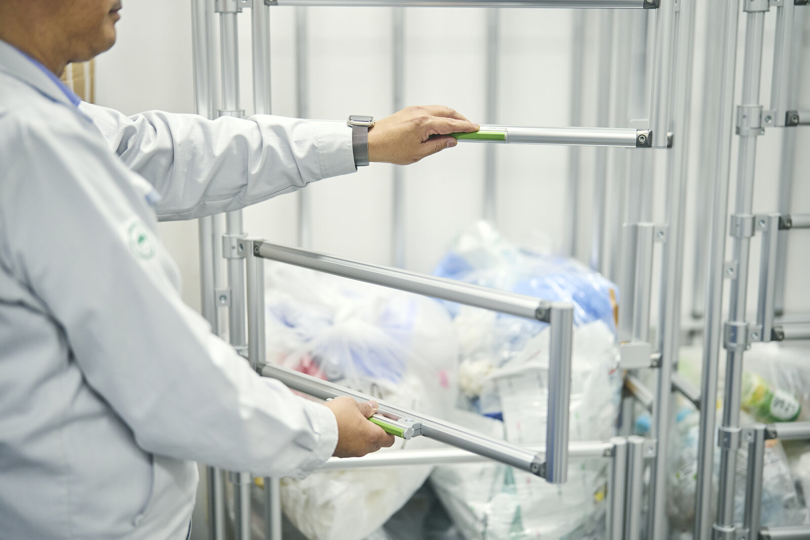 ゴミ袋が重なると雪崩が起きるという困りごとから、出し入れする高さを選べるカートも製作。ムダだけでなくストレスもなくなる。