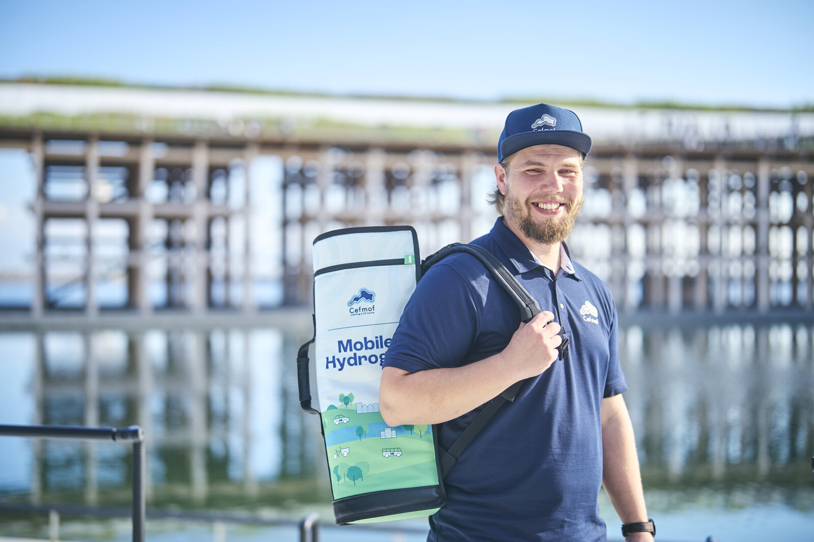 「日本の夏は“ベリームシムシ”しているね」と笑う彼。背負っているのは水素を簡単に持ち運ぶことができる水素カートリッジ。燃料電池車「MIRAI」で培った水素貯蔵技術を応用したものだ。
