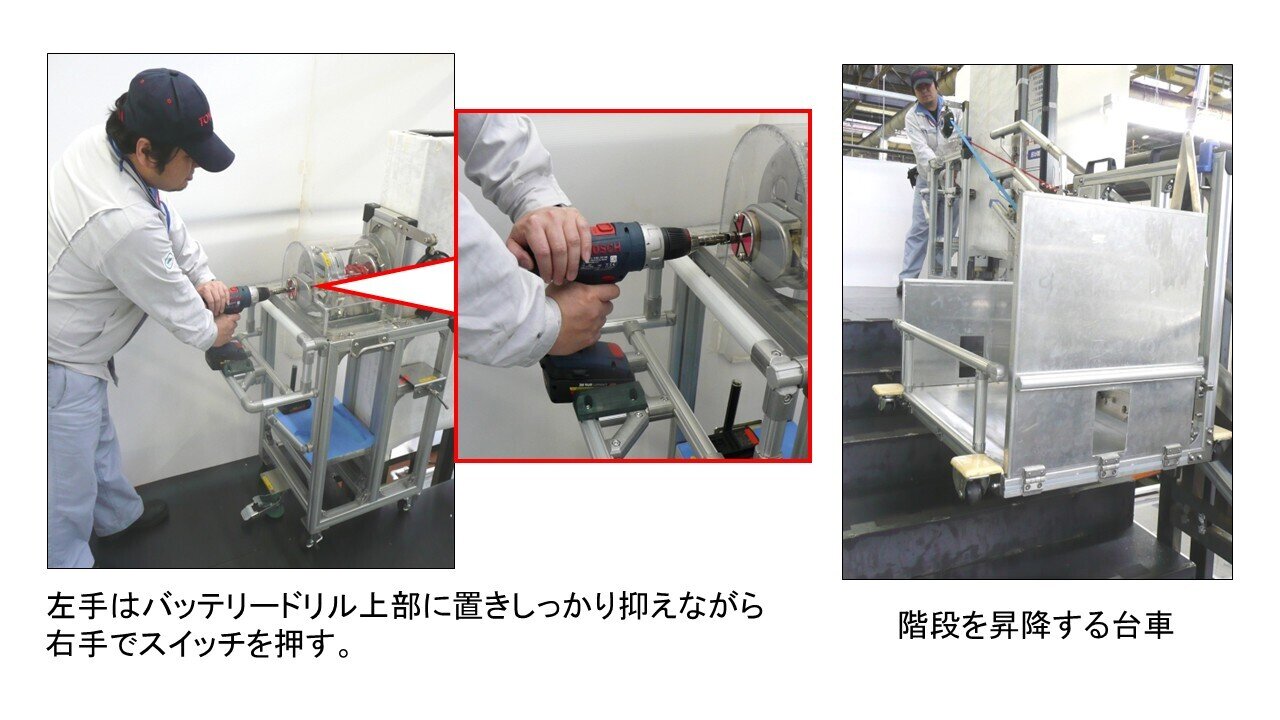 相談を受けた夢創造館のメンバーは、階段の手すりにシャトルを設置し、給食や食器を運ぶ台車を連結できるよう改良。ウィンチ台*を固定し、電動ドライバーのスイッチを押すと、その回転力でロープが巻き取られ、台車が手すりに沿って昇降するようにした。