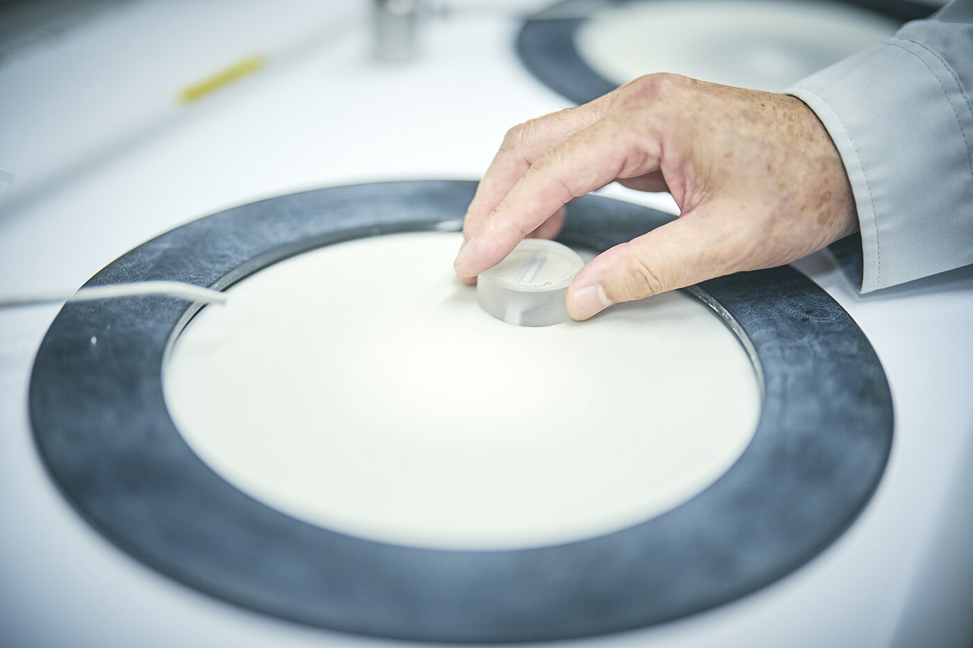 研削が終わると、冒頭で触れた琢磨の工程だ。フェルトのバフに、アルミナと呼ばれるアルミニウムの酸化物の微粒子を水で溶いたものをつけて磨く。粒子の大きさは0.5ミクロンから、最終的には0.02ミクロンまで細かくしていく。