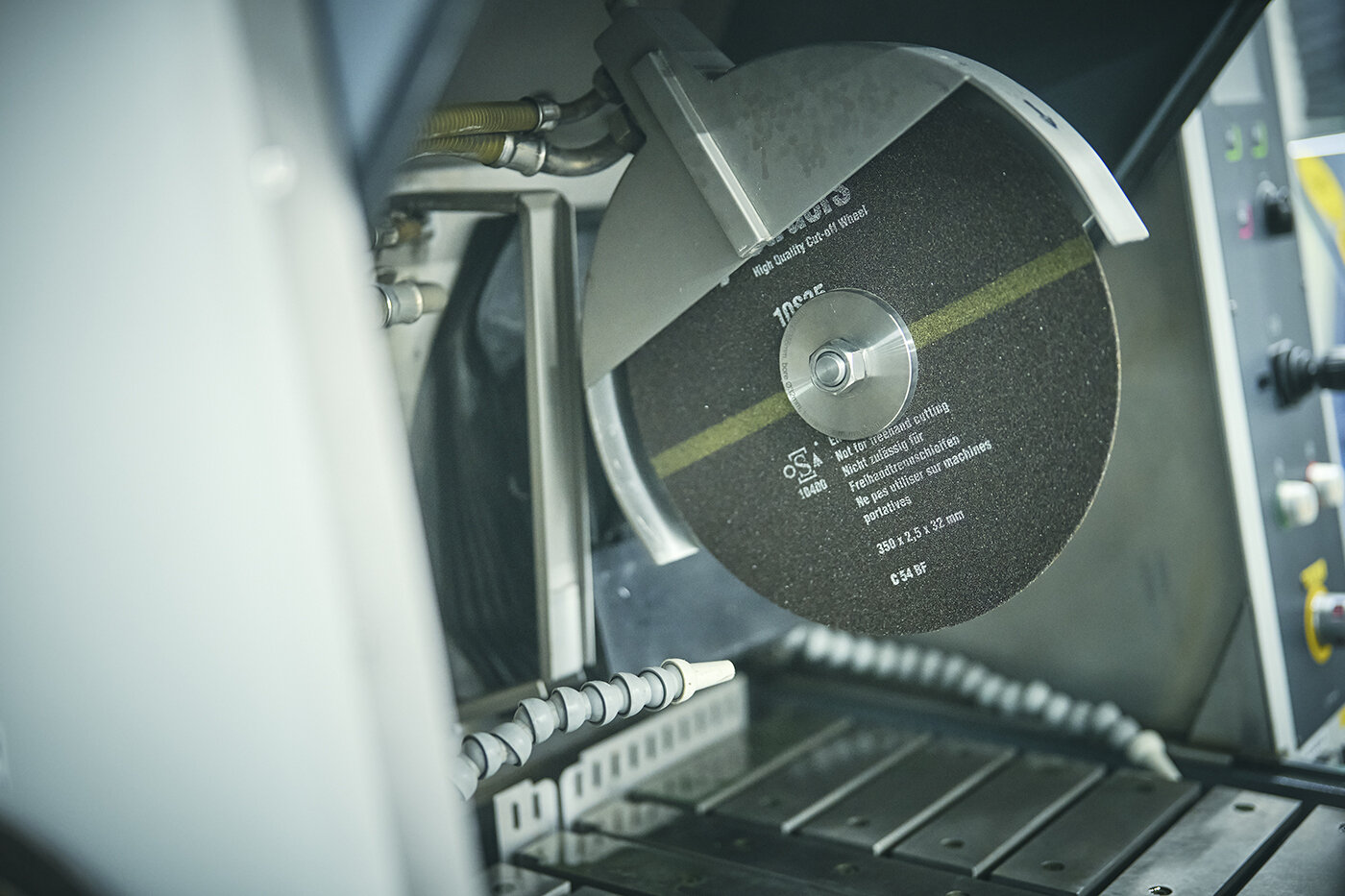 最初の工程は切断だ。グラインダーと呼ばれる回転砥石で、調査したい部分を切り出す。火花を出しながら切ると、摩擦熱で金属の性質が変わってしまう。そこで水で冷却しながら、砥石を材料に押し付ける力を微妙に調整する。