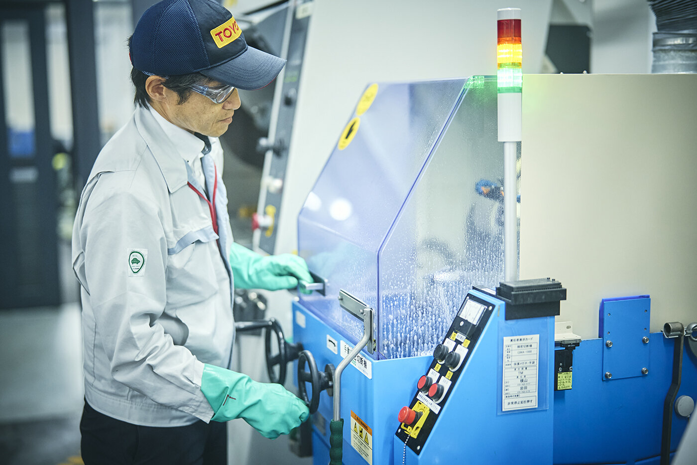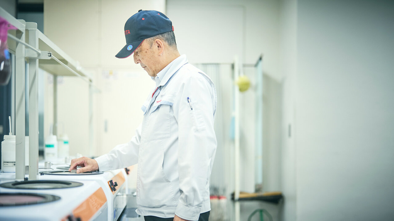 愛知県豊田市のトヨタ自動車本社 技術5号館にある材質調査実験室。高野光雄は、回転するフェルトのバフに金属の断面をそっと当てている。