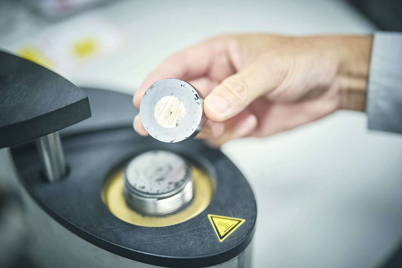 切断が終わると、研削、琢磨作業が行いやすいよう、専用の機械を用いて素材を樹脂に埋め込む。調査する素材は極めて小さいため、実際には樹脂を手で押さえながら研削・琢磨を行うのだ。