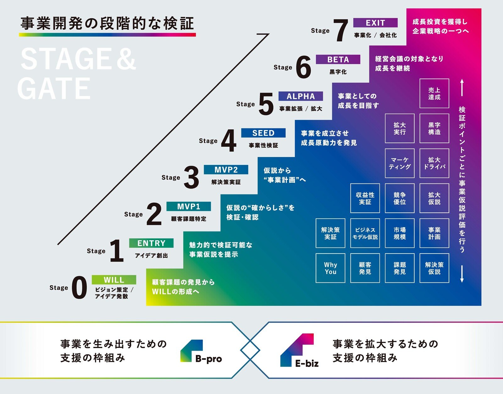 顧客課題の発見を皮切りに、事業仮説の提示、検証・確認、事業計画と、ステージが上がるたびに要求されるレベルも上がる。