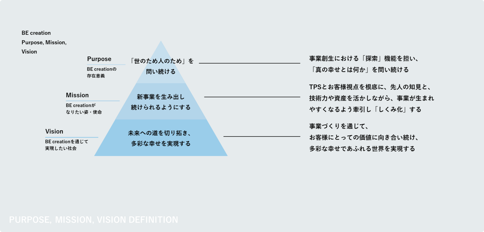 昨年、BE creationの足場固めとして、パーパス・ミッション・ビジョン・バリューを定めました。今後はそれらを軸に、着実にステップアップしていきたいと思います。
