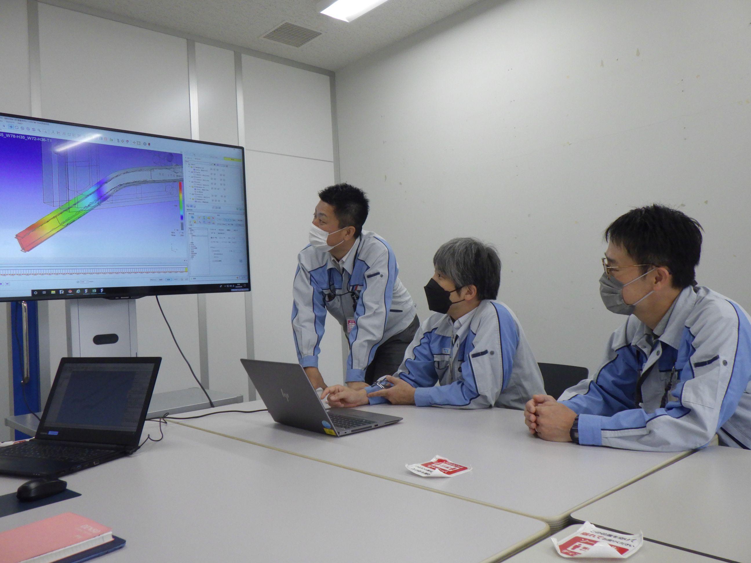 打診を受けた大豊精機の担当者は「お話を伺うと、素材の板厚が厚く長くて成形時の荷重もそれなりに必要。しかも『型レス』と聞いて、これは大丈夫かなと思いましたが、ダメ元で社内に相談すると、金属の丸いパイプを連続的に曲げて3Dで成形する設備が当社にあるので、この設備でつくれないかということになりました。」