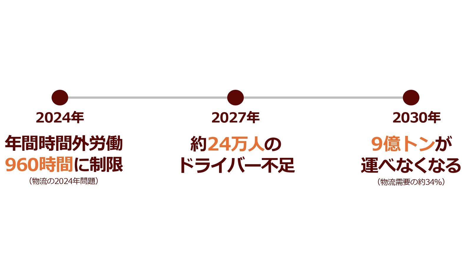 2027年には「ドライバーが約24万人も不足」し、2030年には「物流需要の約34%を運べなくなる」という。わずか4年後に3割以上のモノが届かないなんて、かなり深刻だ…。