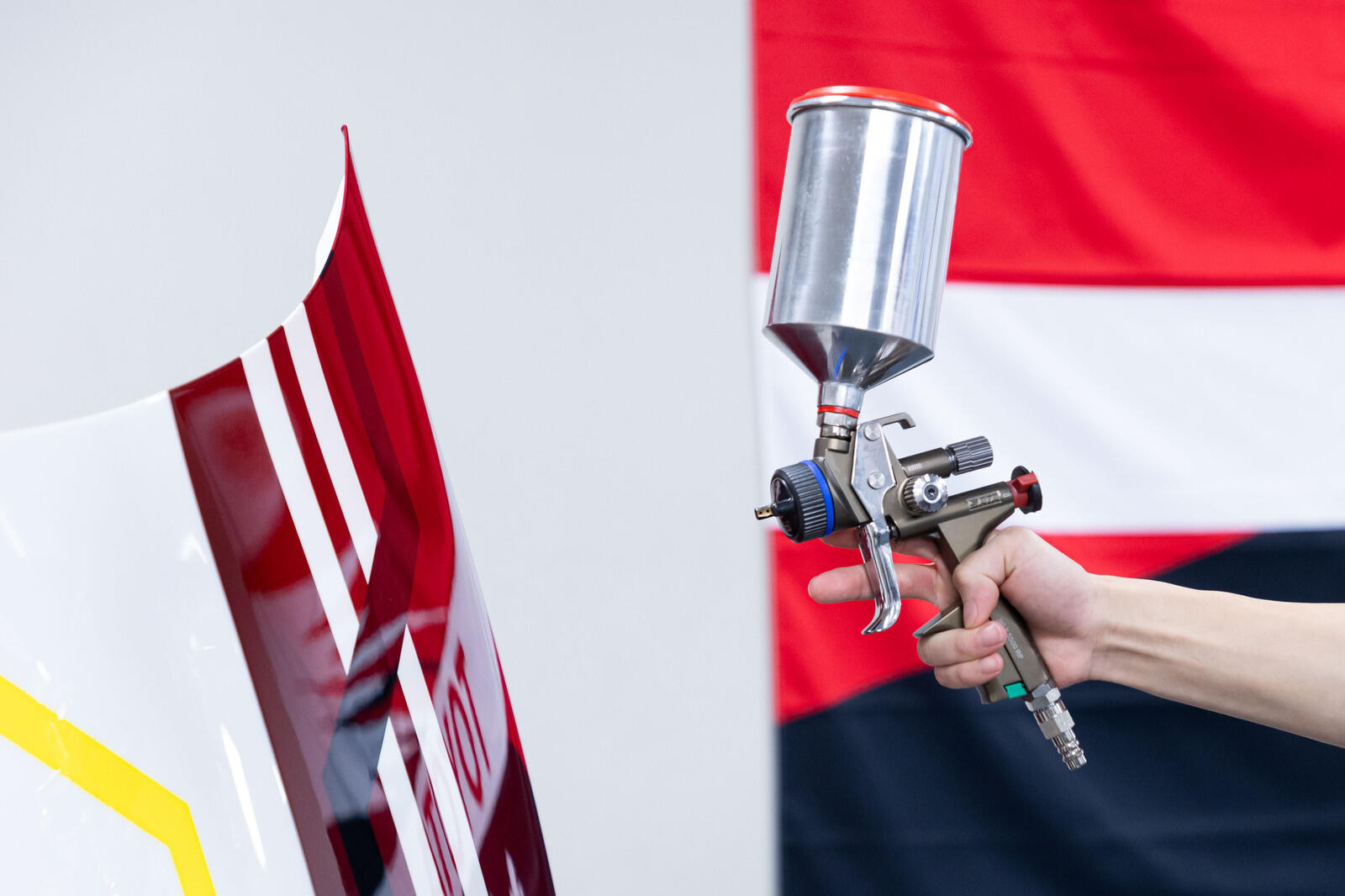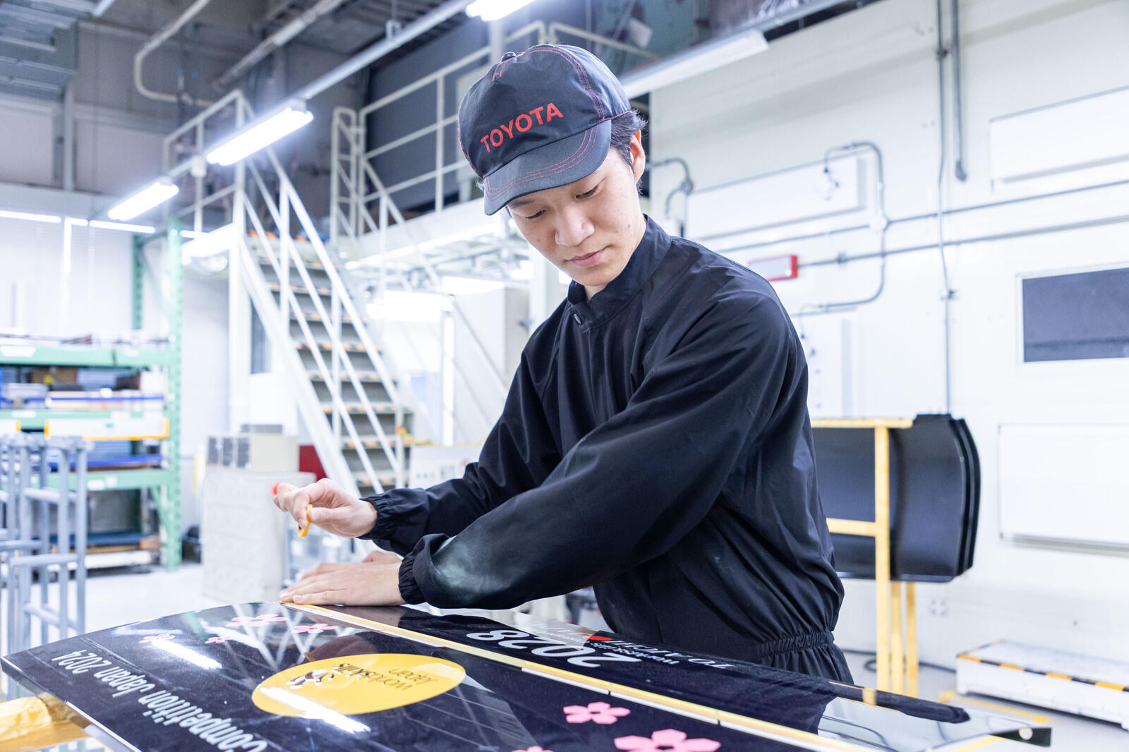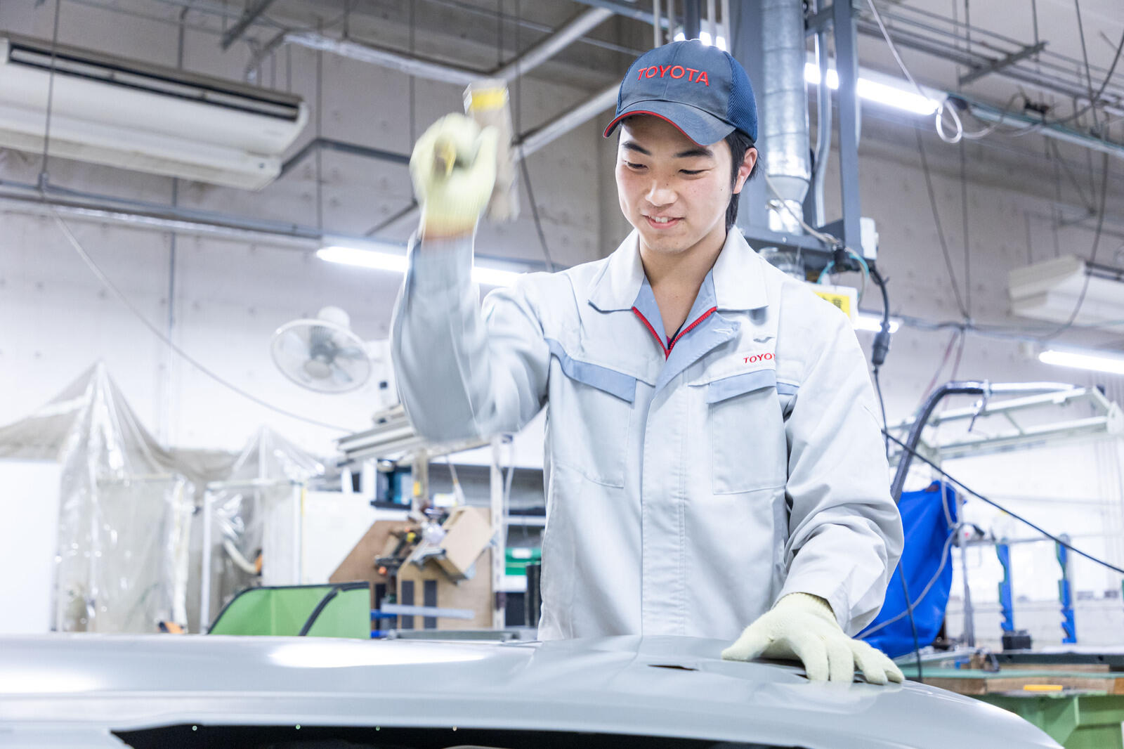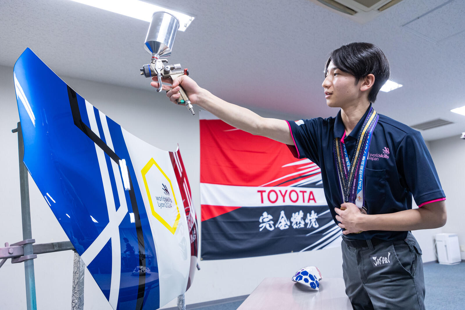 車体塗装・星野 はい。スプレーガンという工具で塗装するんですけど、精密な機械なので、塗料が固まってしまうと綺麗に塗装ができなくて減点につながってしまいます。ですので、そういった手入れや、4Sは大事な職種だと思います。訓練の時からみんな綺麗に使っています。