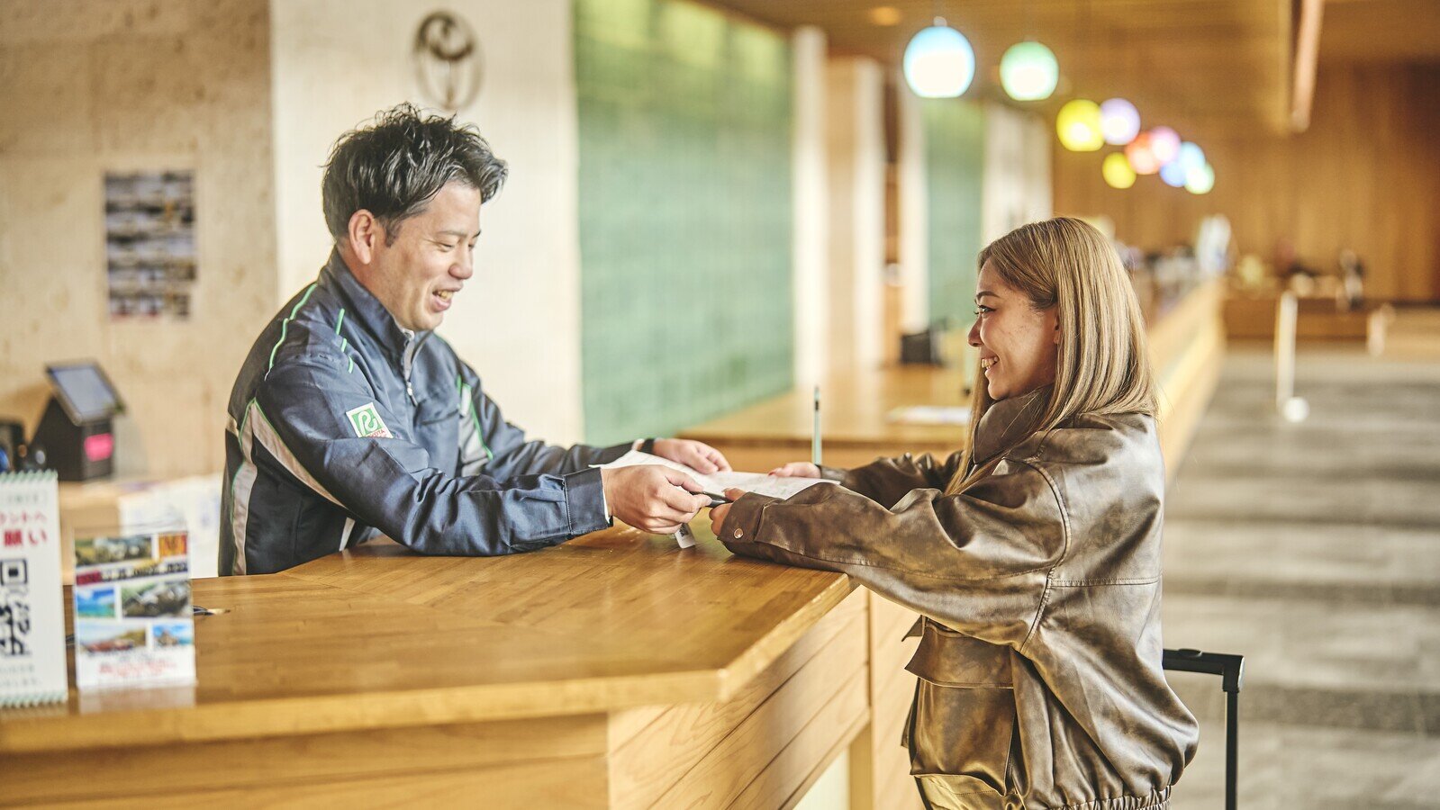 どれほどスムーズになったか疑似体験していただきたい。まず、空港からの送迎バスで店舗に着くと、スタッフの誘導で迷わず受付へ。