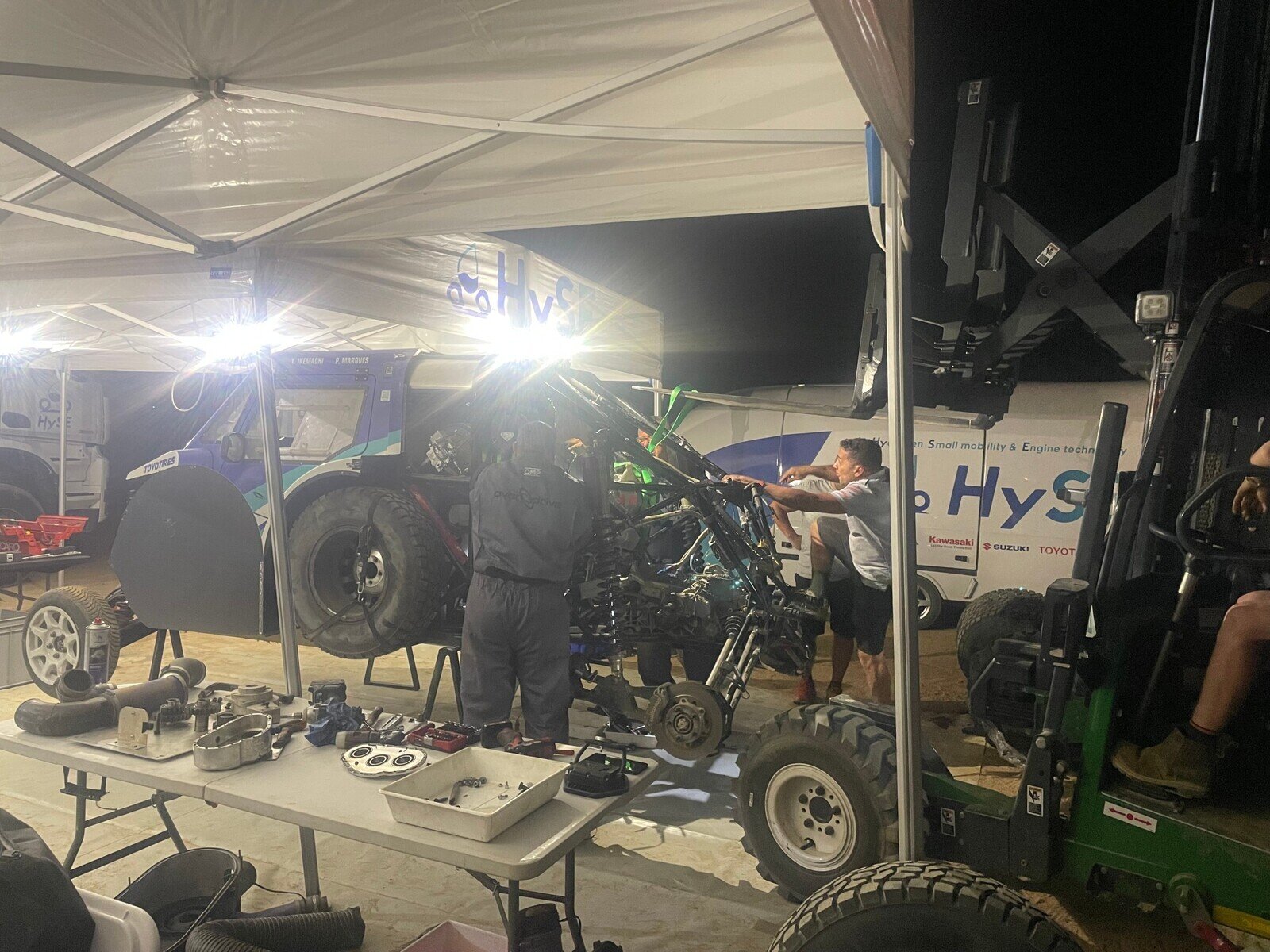 水素は高圧タンクに貯蔵されているが、全開走行が続くと断熱膨張に近い現象が起き、タンク内部の温度が急激に低下する。低下し過ぎるとタンク使用制限範囲を超えてしまうため、安全面も考慮して自動的にトルクを制限する機能が働く。ダカールのような過酷なレースでは、この「10分で制限がかかる」という制約が大きな戦略的課題となった。