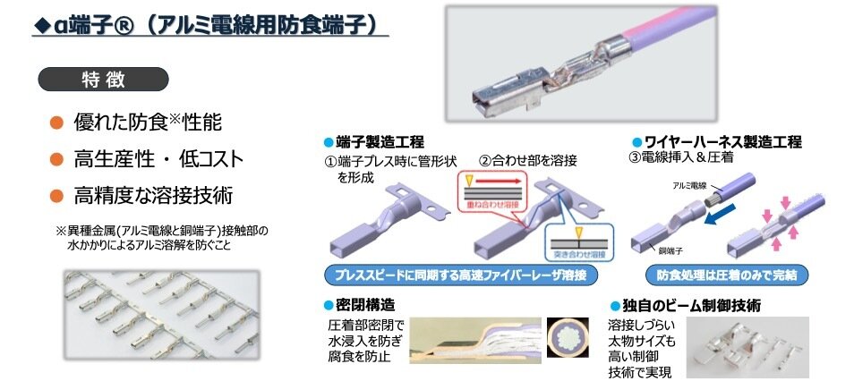 そこで今回導入したアルミ電線には、古河電気工業が開発したファイバーレーザー溶接技術をもちいた密閉構造端子(α端子®️)を採用した。