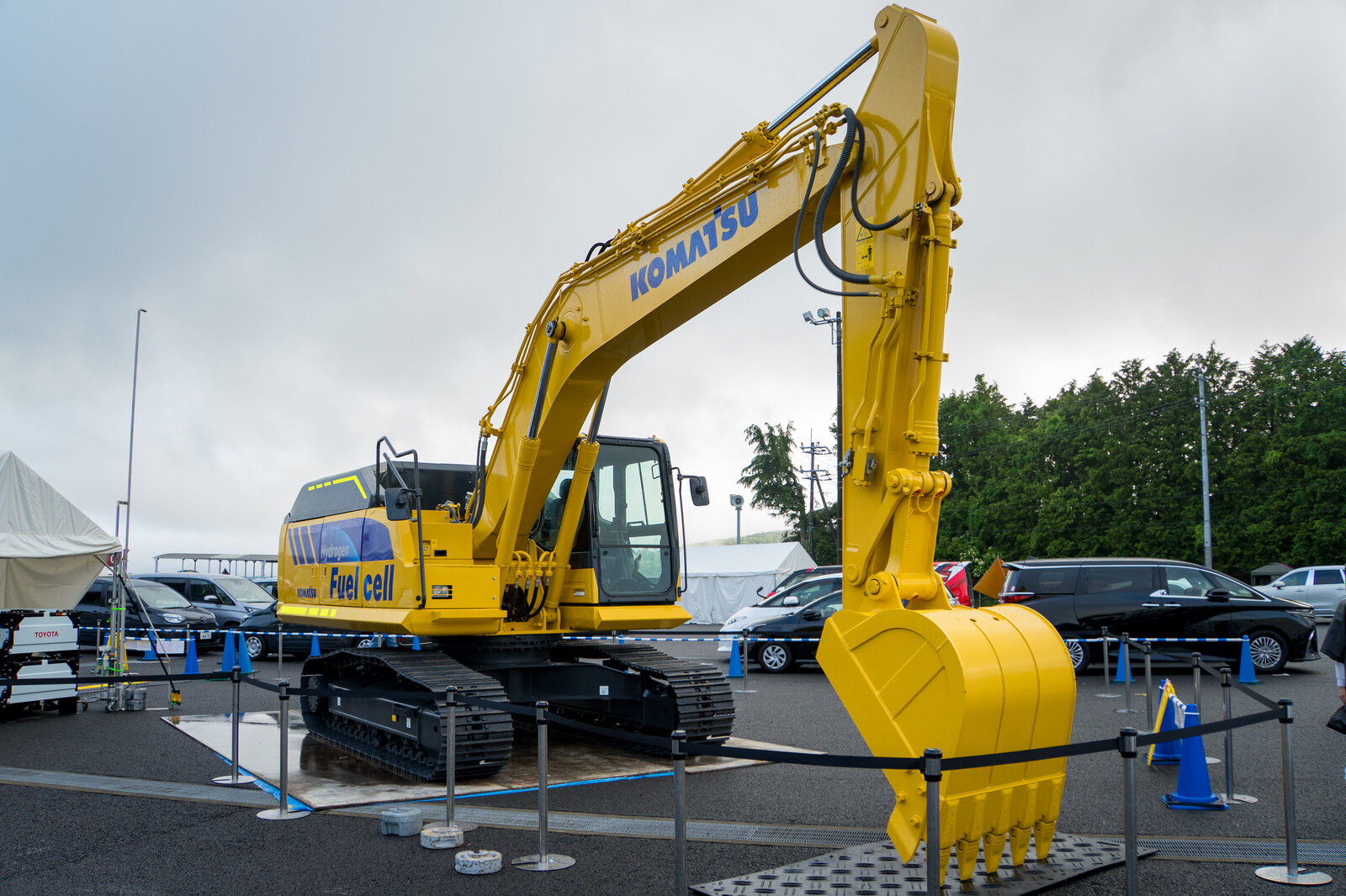 今回、初展示となったのが、コマツの20t 油圧ショベルだ。この油圧ショベルは燃料電池(FC)で稼働し、建設現場からCNを目指す。