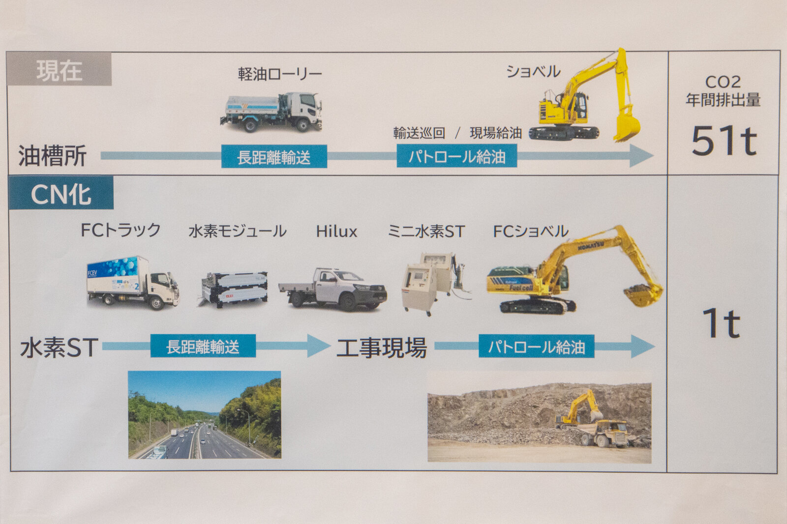 こちらをユースケースにCN化で、FCEVトラックをつかったり、FCショベル、残念ながらハイラックスはFCEVのトライアルはしていますが、現在商品が無いのですが悪路を走らなければいけない可能性がるということで、ディーゼルのハイラックスを使った場合、総CO2排出量は1tで済みます。