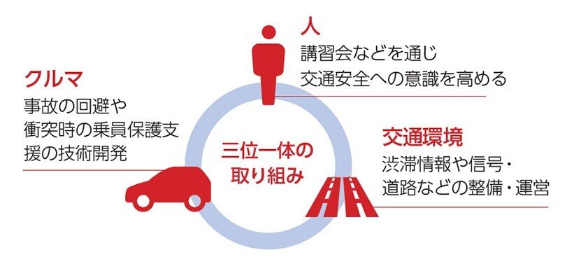 モビリティ社会の究極の願い「交通事故ゼロ」。その実現に向け、トヨタはかねてから、安全な「クルマ」の開発だけでなく、ドライバーや歩行者などの「人」、信号や道路などの「交通環境(インフラ)」も含めた「三位一体」のアプローチが大切だと訴えてきた。