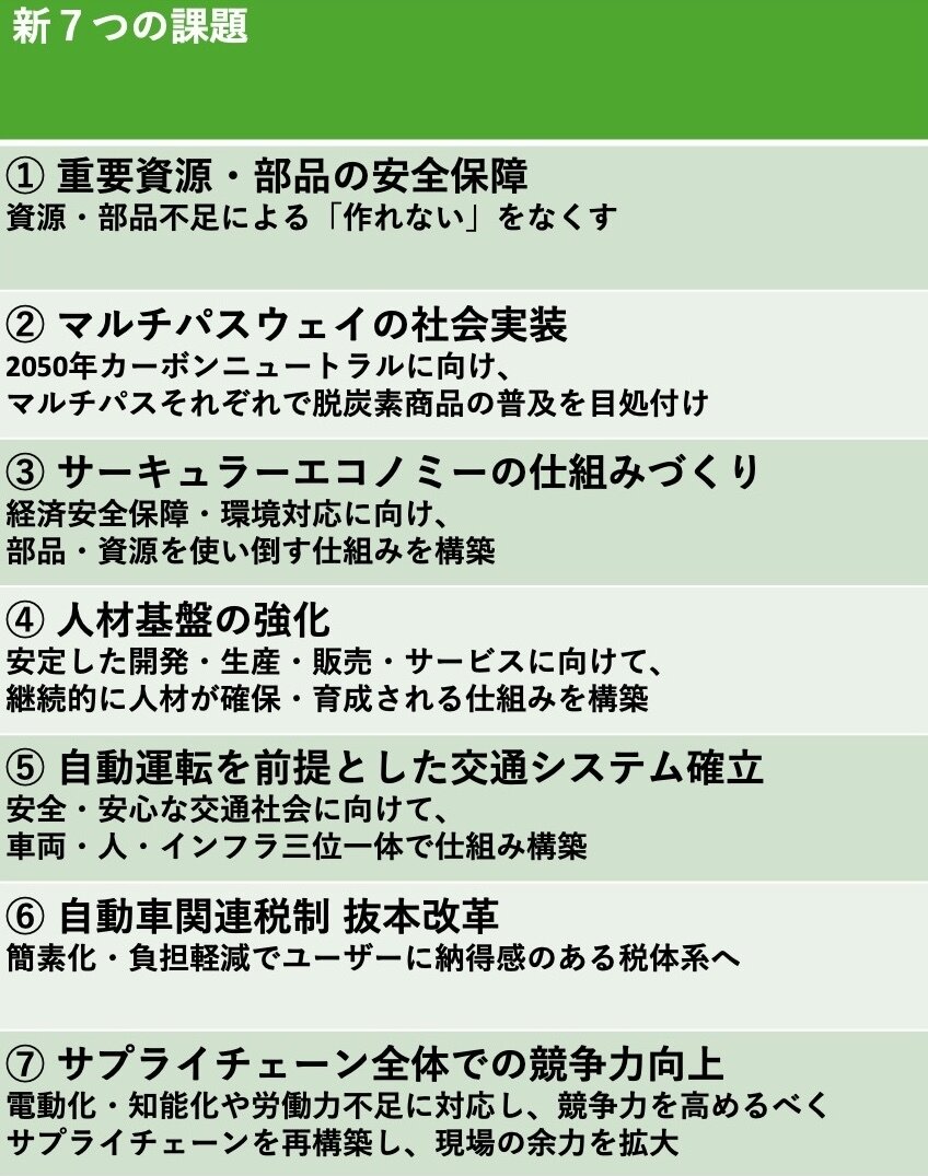 1月1日に佐藤恒治新会長(トヨタ)が就任し、23日には新体制による1回目のミーティングおよび説明会を実施。そこでは、自動車業界の国際競争力強化に向けた「新7つの課題」について説明があった。