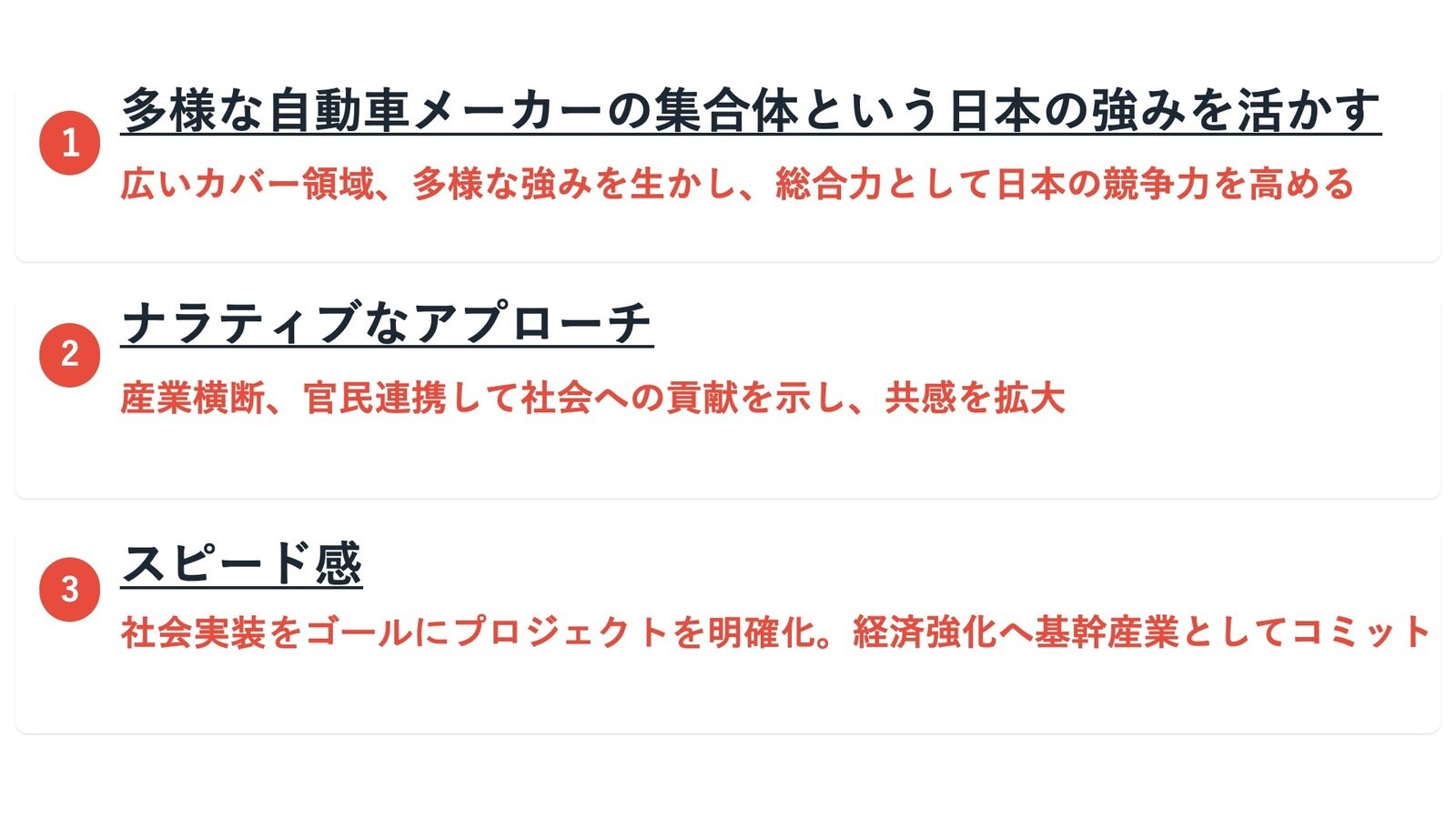 3点目の社会実装へのスピード感について、自動車産業は、政府が掲げる「強い経済」を実現するための「重点17領域」に入っていない。