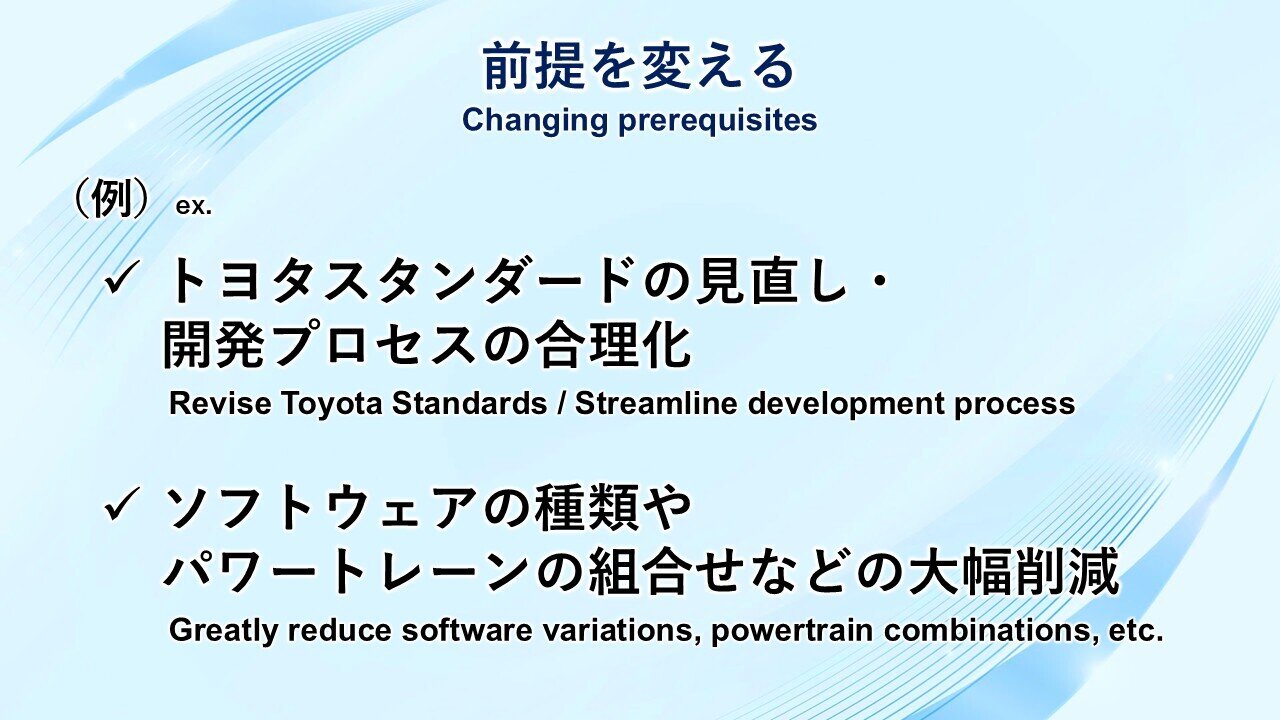 さらに開発の上流から前提条件を変えて、ソフトウェアの種類やパワートレーンの組み合わせの数を大きく減らしてまいります。