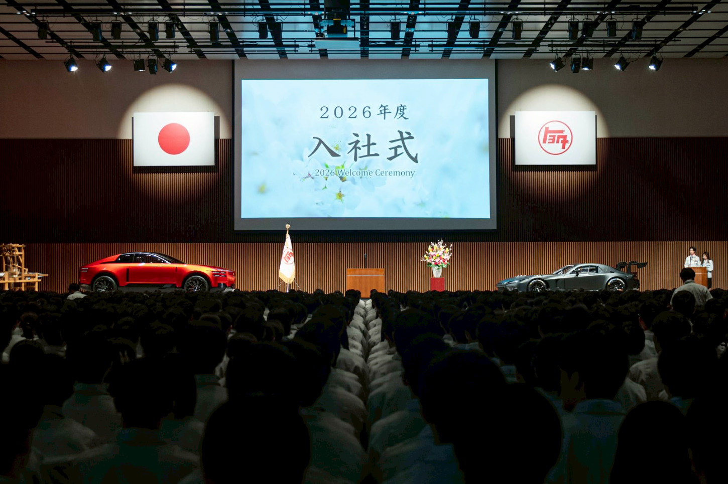 入社式の壇上にクルマが並ぶのは、2019年に赤いスープラが展示され、エンジン音を響かせて以来だ。