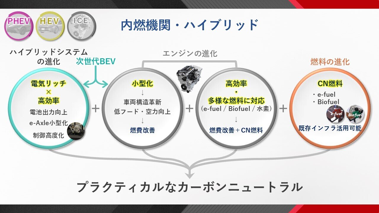 内燃機関のクルマでは、要素技術を磨き、「エンジン」「ハイブリッドシステム」、そして、「燃料」それぞれの進化に挑戦し続けています。